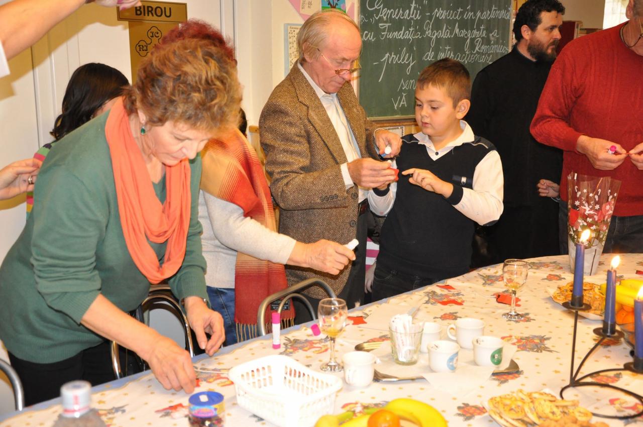 În atelierul lui Moș Crăciun, copii și voluntari au realizat ornamente pe care apoi le-au așezat în brăduțul ce aștepta cuminte într-un colț. „Iubirea îmi inundă sufletul când vin aici, în mijlocul copiilor, și mă face să simt că sentimentul care trăiește și vibrează în mine este utilitatea, credința că viața însăși este o magie la orice vârstă!”, a spus atât de frumos și sensibil în cuvinte meșteșugite doamna Marinela Dănilă. La încheierea activității, seniorii au primit daruri de la sponsorul proiectului „Generații”. Ne arătăm recunoștința față de seniorii care vin cu atâta dragoste între copii, ajutându-i cu răbdare, cu dragoste și cu toată priceperea lor! Dumnezeu să-i binecuvânteze cu sănătate și bucurii nemăsurate și Îl rugăm să ne rămână alături și după finalizarea proiectului!