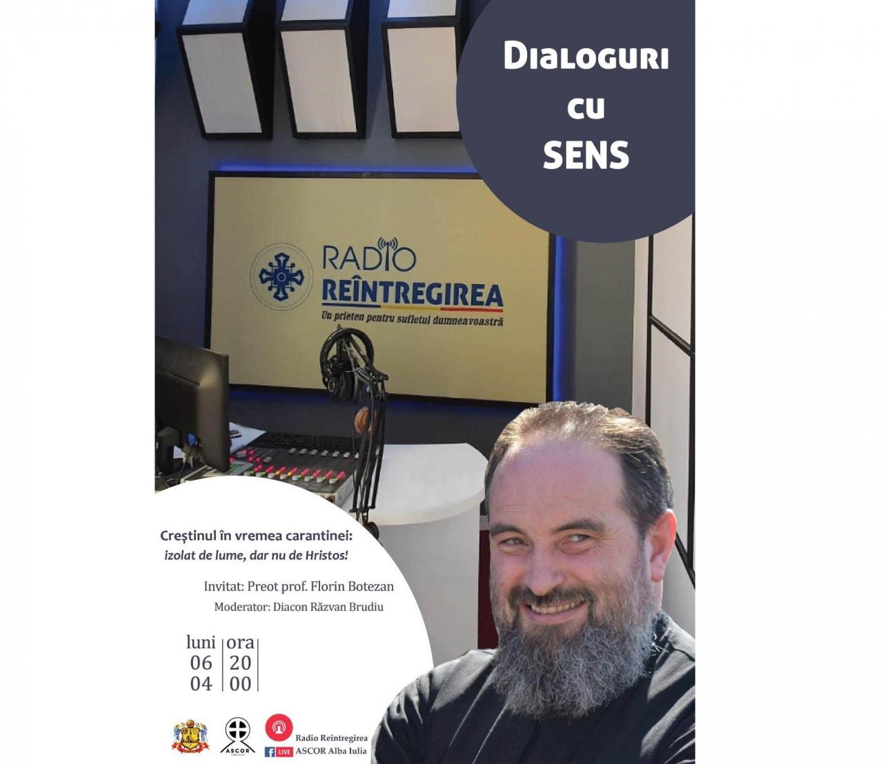 Seria evenimentelor derulate sub genericul „Dialoguri cu Sens”, organizate de către Arhiepiscopia Ortodoxă a Alba Iuliei, în parteneriat cu Radio Reîntregirea, Facultatea de Teologie Ortodoxă și Asociația Studenților Creștini Ortodocși Români (ASCOR) – Filiala Alba Iulia, va continua și în perioada următoare. Cea de-a doua ediție a întâlnirilor interactive în mediul virtual va avea loc luni, 6 aprilie, de la ora 20:00, în compania părintelui diacon Răzvan Brudiu, invitat special fiind părintele profesor Florin Botezan, cadru didactic la Seminarul Teologic Ortodox „Sfântul Simion Ștefan” din Alba Iulia.