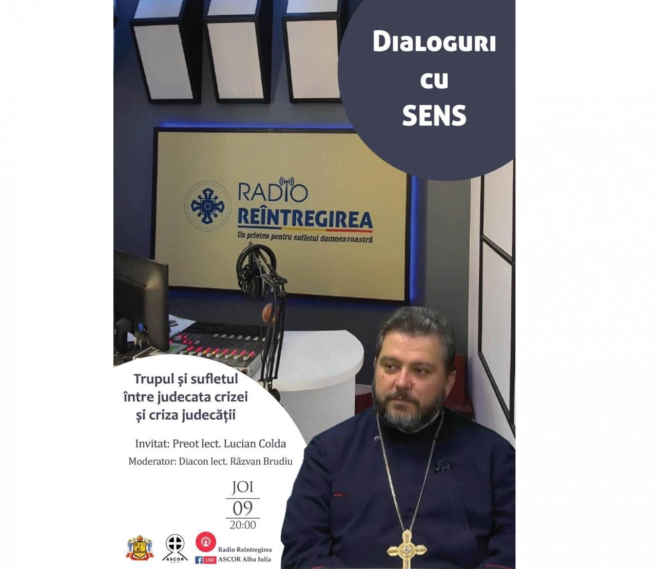 Joi, 9 aprilie, de la ora 20:00, va avea loc cea de-a treia ediție a întâlnirilor interactive intitulate „Dialoguri cu Sens”, organizate de către Arhiepiscopia Ortodoxă a Alba Iuliei, în parteneriat cu Radio Reîntregirea, Facultatea de Teologie Ortodoxă și Asociația Studenților Creștini Ortodocși Români (ASCOR) – Filiala Alba Iulia. Emisiunea, moderată de către părintele diacon Răzvan Brudiu, îl va avea ca invitat special pe părintele Lucian Colda, cadru didactic universitar la Facultatea de Teologie Ortodoxă din Alba Iulia.