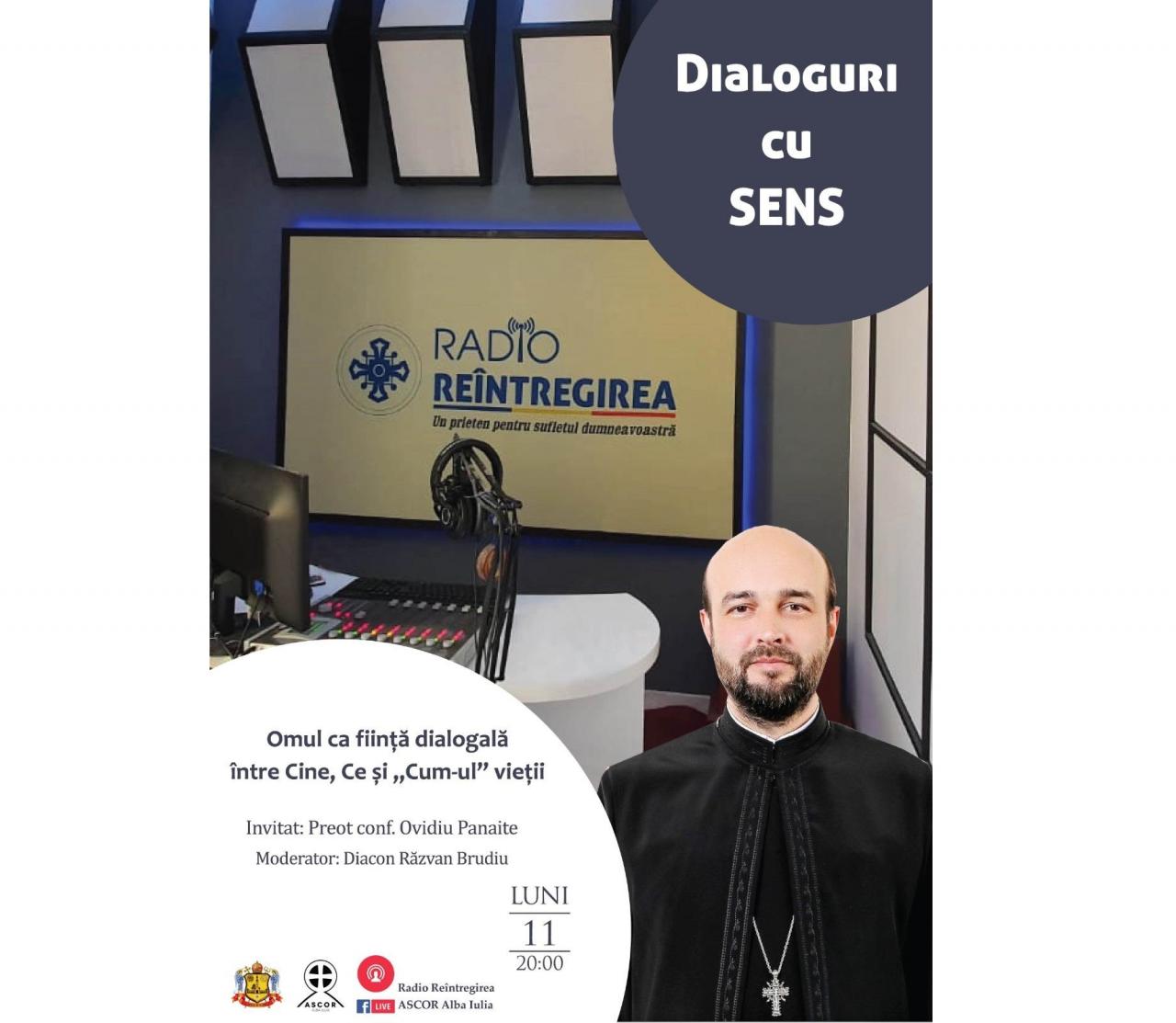 Luni, 11 mai, de la ora 20:00, va avea loc cea de-a zecea ediție a întâlnirilor interactive intitulate „Dialoguri cu Sens”, organizate de către Arhiepiscopia Ortodoxă a Alba Iuliei, în parteneriat cu Radio Reîntregirea, Facultatea de Teologie Ortodoxă și Asociația Studenților Creștini Ortodocși Români (ASCOR) – Filiala Alba Iulia. Emisiunea, moderată de către părintele diacon Răzvan Brudiu, îl va avea ca invitat special pe părintele profesor Ovidiu Panaite, cadru didactic universitar la Facultatea de Teologie Ortodoxă din Alba Iulia.