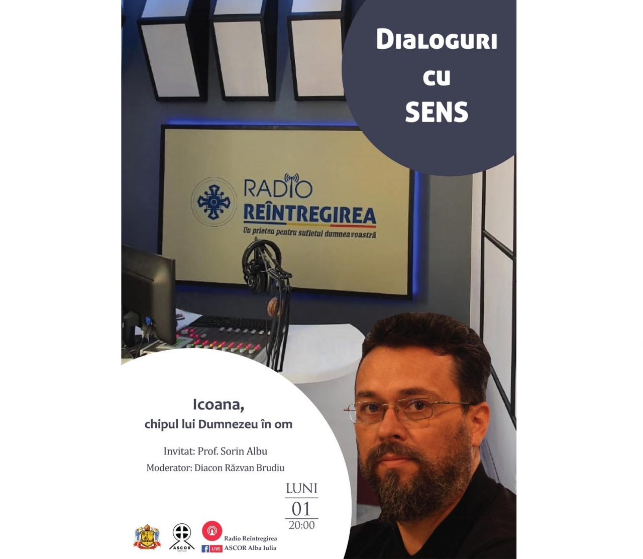 Seria evenimentelor derulate sub genericul „Dialoguri cu Sens”, organizate de către Arhiepiscopia Ortodoxă a Alba Iuliei, în parteneriat cu Radio Reîntregirea, Facultatea de Teologie Ortodoxă și Asociația Studenților Creștini Ortodocși Români (ASCOR) – Filiala Alba Iulia, continuă. Cea de-a treisprezecea ediție a întâlnirilor interactive în mediul virtual va avea loc luni, 1 iunie, de la ora 20:00, în compania părintelui diacon Răzvan Brudiu, invitat special fiind domnul profesor Sorin Albu, cadru didactic asociat la Facultatea de Teologie Ortodoxă din Alba Iulia (secția „Artă sacră”).