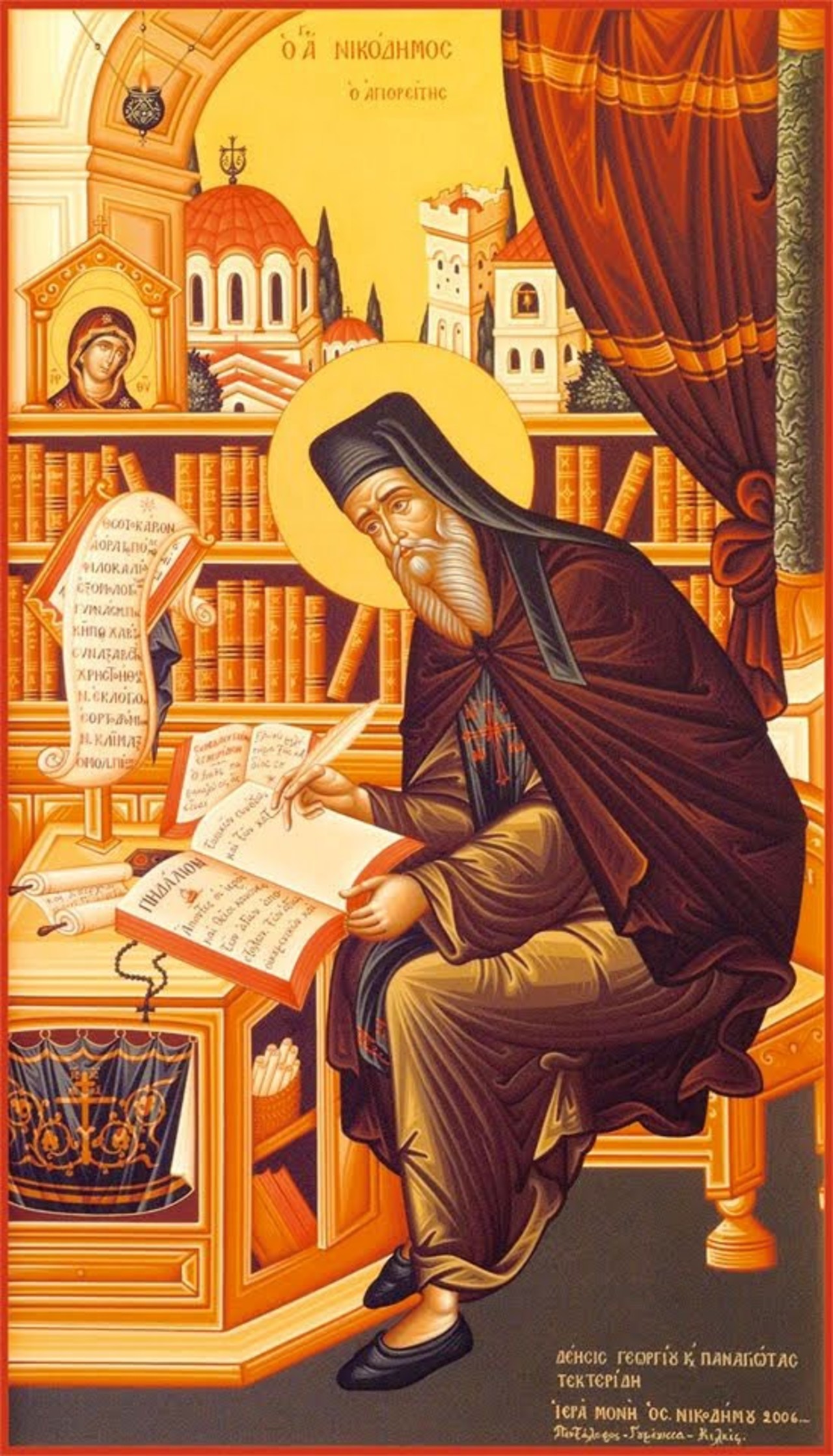 În fiecare an în data de 14 iulie Biserica Ortodoxă cinsteşte un Sfânt - model pentru teologia ortodoxă contemporană: Nicodim Aghioritul. Sfântul Nicodim Aghioritul (1749-14 iulie 1809), cu numele de botez Nicolae, călugărit la mânăstirea Dionisiu de la Muntele Athos, a fost îndemnat de un alt Sfânt, Macarie din Corint, să înceapă o lucrare de traducere şi revizuire a unor scrieri duhovniceşti din vechime, precum: „Filocalia", scrieri ale Sfântului Simeon Noul Teolog, ale Sfântului Grigorie Palama ş.a. Nu a realizat simple traduceri şi nici simple „antologii" de texte patristice sau de canoane.
