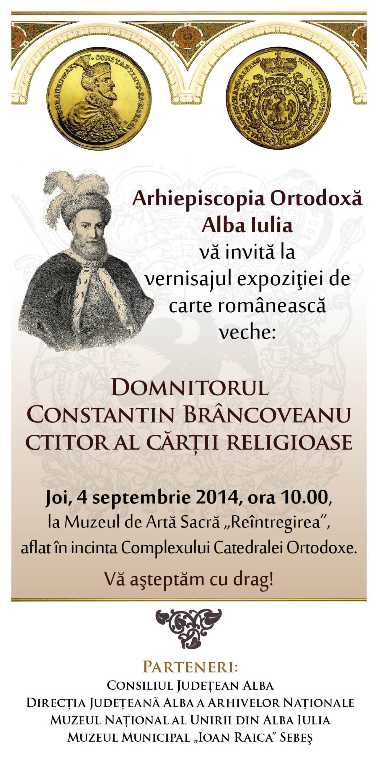 Arhiepiscopia Ortodoxă de Alba Iulia, organizează expoziţia de carte românească veche intitulată „Domnitorul Constantin Brâncoveanu Ctitor al cărţii religioase”.