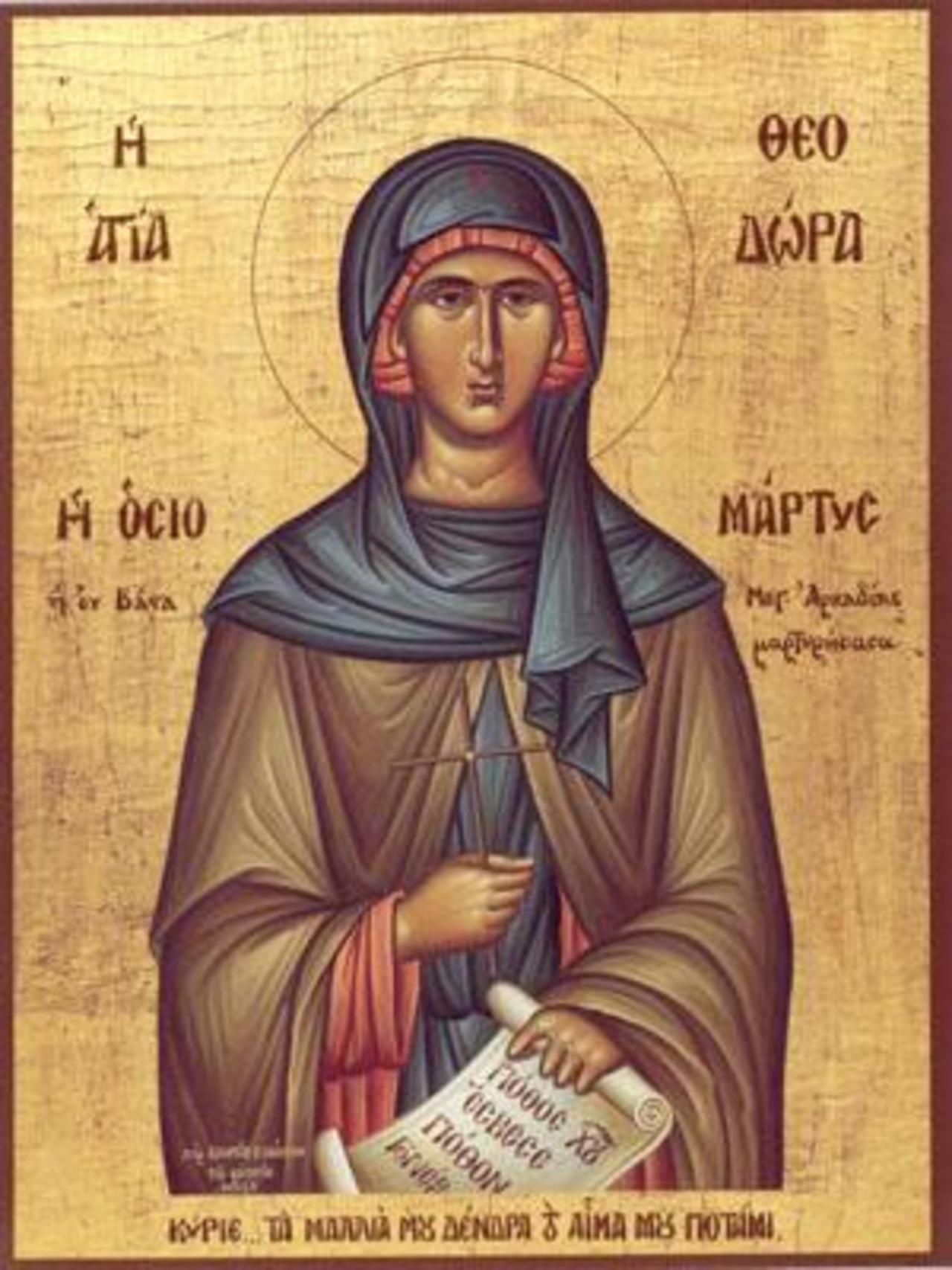 Sfânta Teodora a trăit în Alexandria, din Egipt, în timpul împăratului Zenon din Constantinopol (474-491). Părinţii ei, bogaţi, au măritat-o de tânără cu un om de seamă şi era fericită. Dar, fiind tânără şi frumoasă, s-a lăsat ademenită de stăruinţele unui tânăr şi a căzut în desfrânare. După ce a săvârşit păcatul, s-a întristat şi a început a se tângui cu amar. Apoi a intrat într-o mănăstire îmbrăcându-se în haine de bărbat, recomandându-se cu numele Teodor.