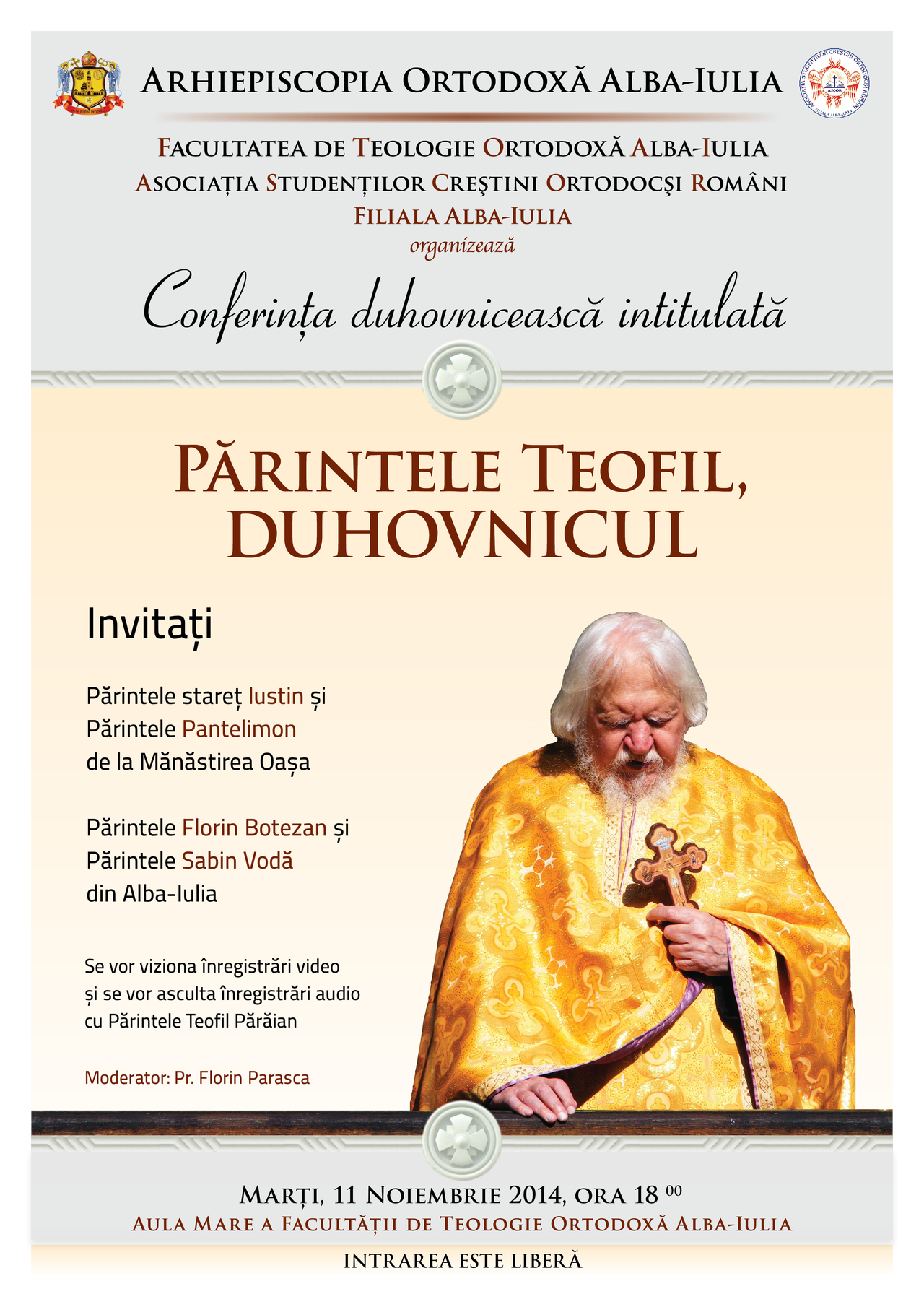 Asociaţia Studenţilor Creştini Ordodocşi din Alba Iulia vă invită, mâine 11 noiembrie 2014, la conferința duhovnicescă cu tema Părintele Teofil DUHOVNICUL.