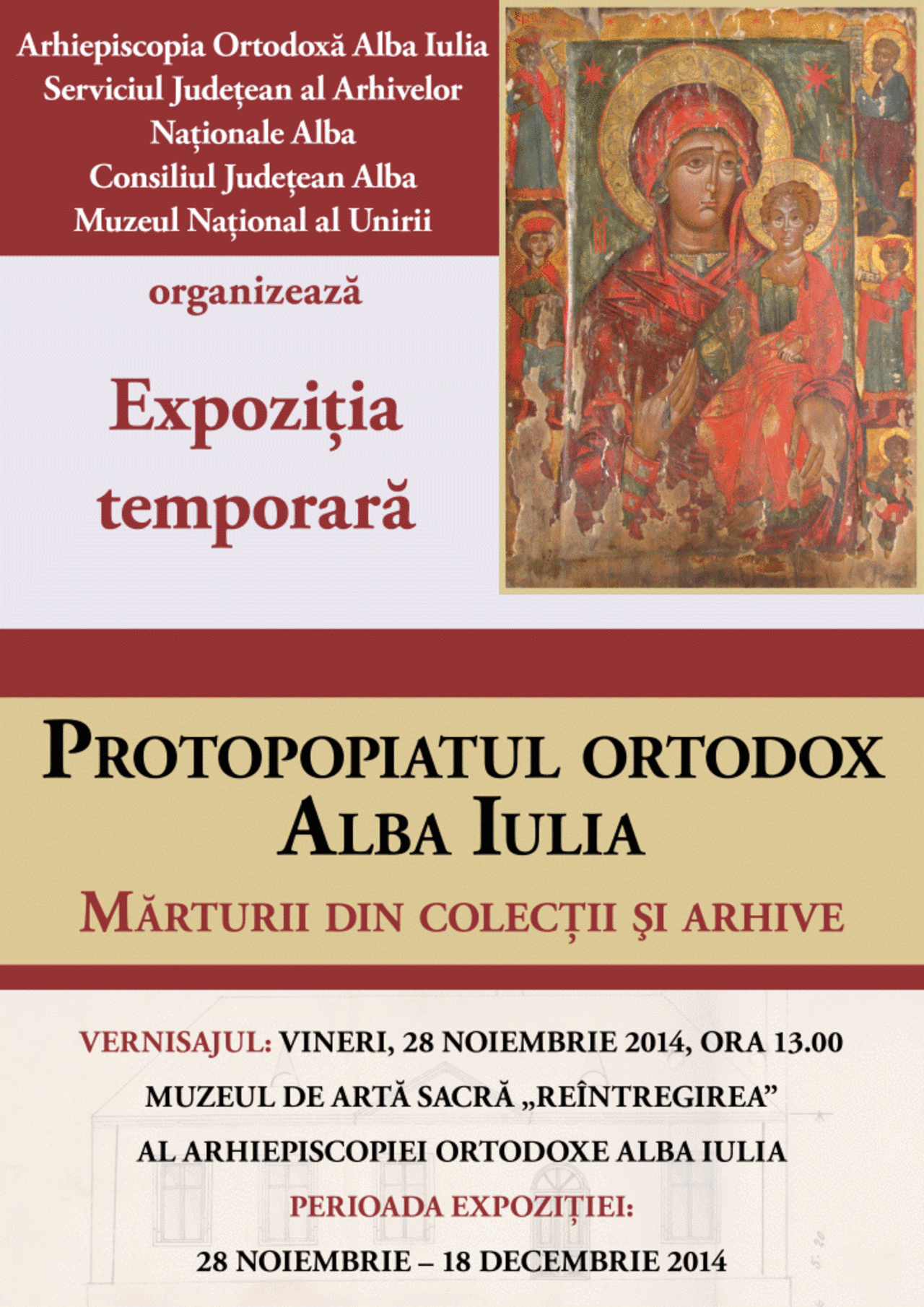 Vernisajul va avea loc VINERI, 28 noiembrie 2014, ora 13.00, la Muzeului de Artă Sacră „Reîntregirea” al Arhiepiscopiei Ortodoxe Alba Iulia, aflat în incinta Complexului Catedralei Încoronării.