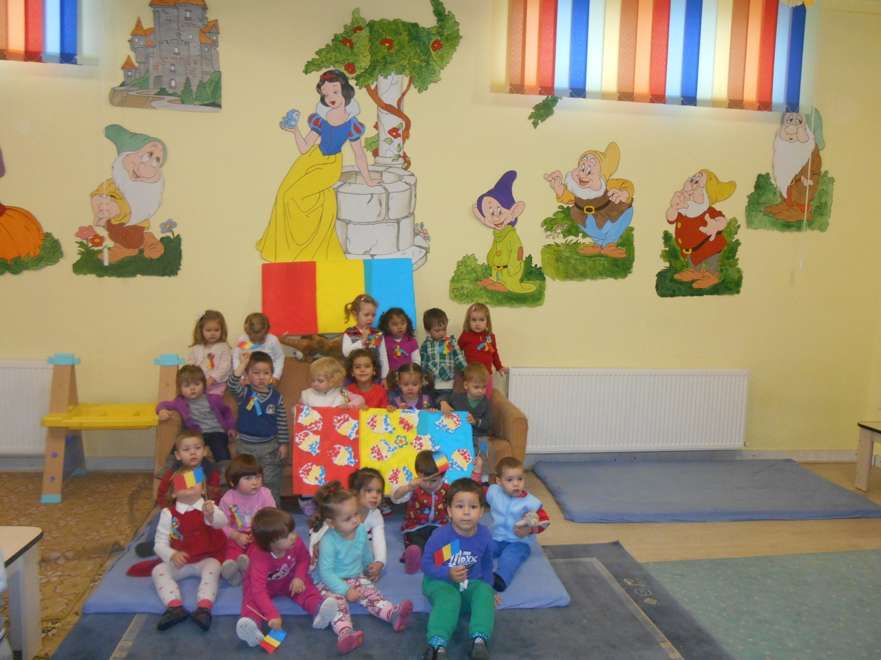 Prichindeii de la Centrul de zi pentru copii antepreşcolari „Sfânta Irina” din Blaj s-au pregătit aşa cum se cuvine pentru Ziua Naţională a României. Copiii, îndrumaţi de personalul centrului, au participat săptămâna aceasta la o serie de activităţi derulate sub genericul „Noi suntem români”. Micuţii au făcut cunoştinţă cu steagul şi harta României, au ascultat Imnul României şi au jucat Hora Unirii în cadrul jocului - exerciţiu „Ţara mea”.