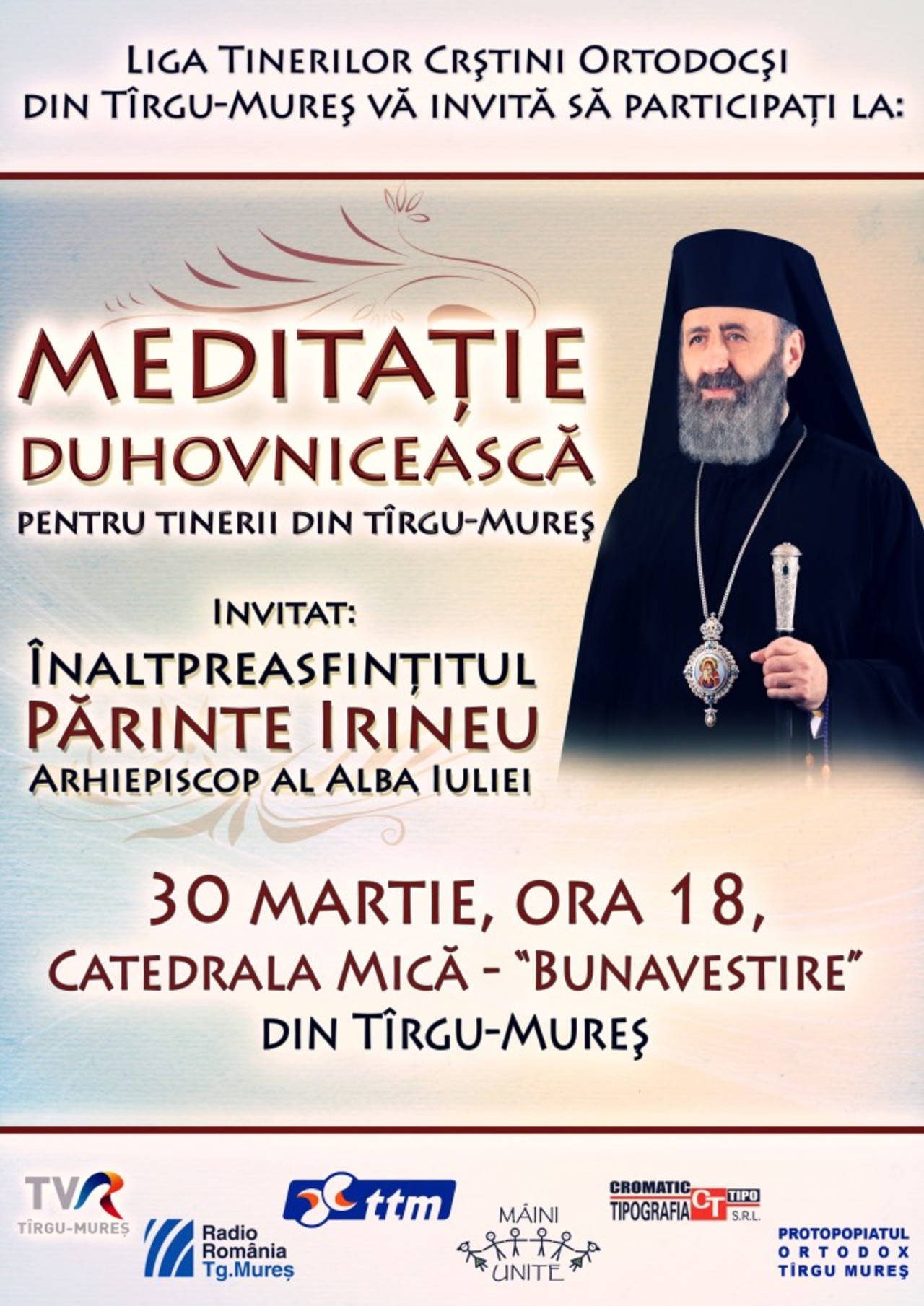 Astăzi, 30 martie, Liga Tinerilor Ortodocşi din Târgu-Mureş, tineri preocupaţi şi de frumuseţea şi sănătatea sufletului, vor organiza o seară duhovnicească. Celor care vor participa li se propune o seară de suflet în cadrul căreia se vor întâlni cu Arhipăstorul nostru, Înaltpreasfinţitul Părinte Arhiepiscop Irineu al Alba Iuliei şi care va susţine o prelegere duhovnicească dedicată tinerilor mureşeni, cu titlul „Trăind în atmosfera protectoare a lui Hristos”.