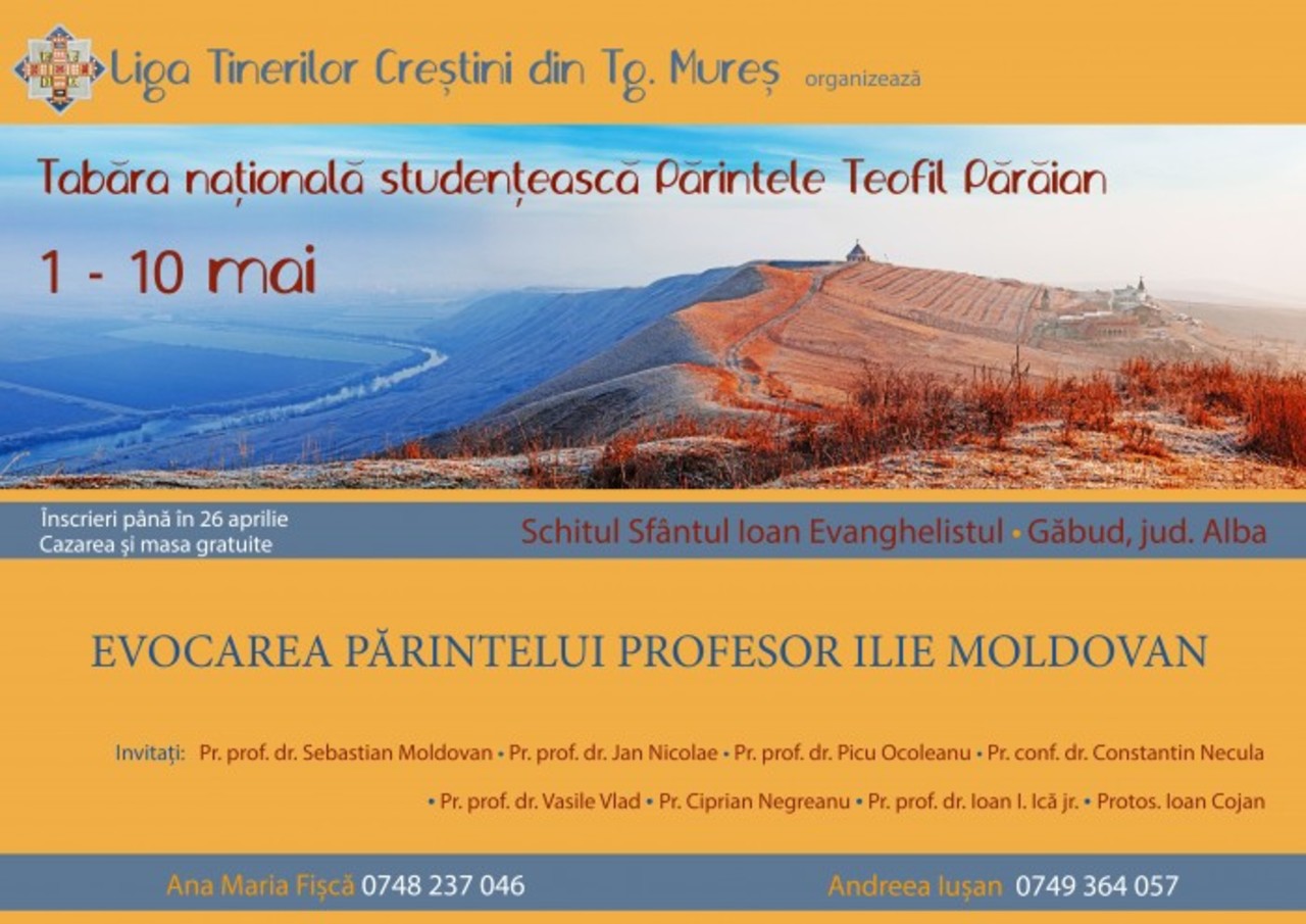 Tabăra se va desfăşura în perioada 1-10 Mai, la Schitul Sfântul Ioan Evanghelistul de la Găbud (metocul Mănăstirii Oaşa) şi va avea ca temă „Evocarea Părintelui Profesor Ilie Moldovan”