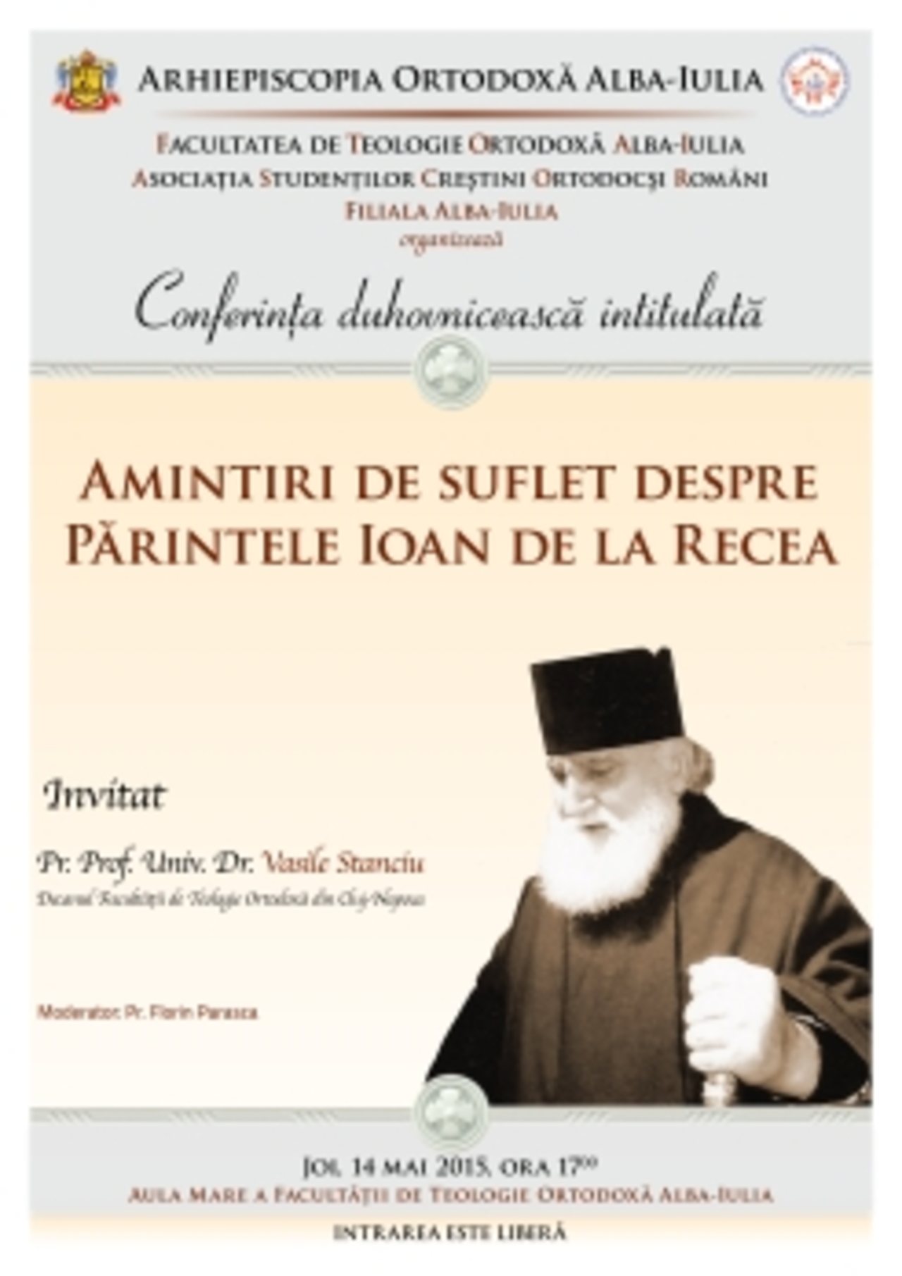 Arhiepiscopia Ortodoxă Alba Iulia, Facultatea de Teologie Ortodoxă Alba Iulia şi Asociaţia Studenţilor Creştini Ortodocşi filiala Alba Iulia organizează conferinţa duhovnicească intitulată „Amintiri de suflet despre părintele Ioan de la Recea”.