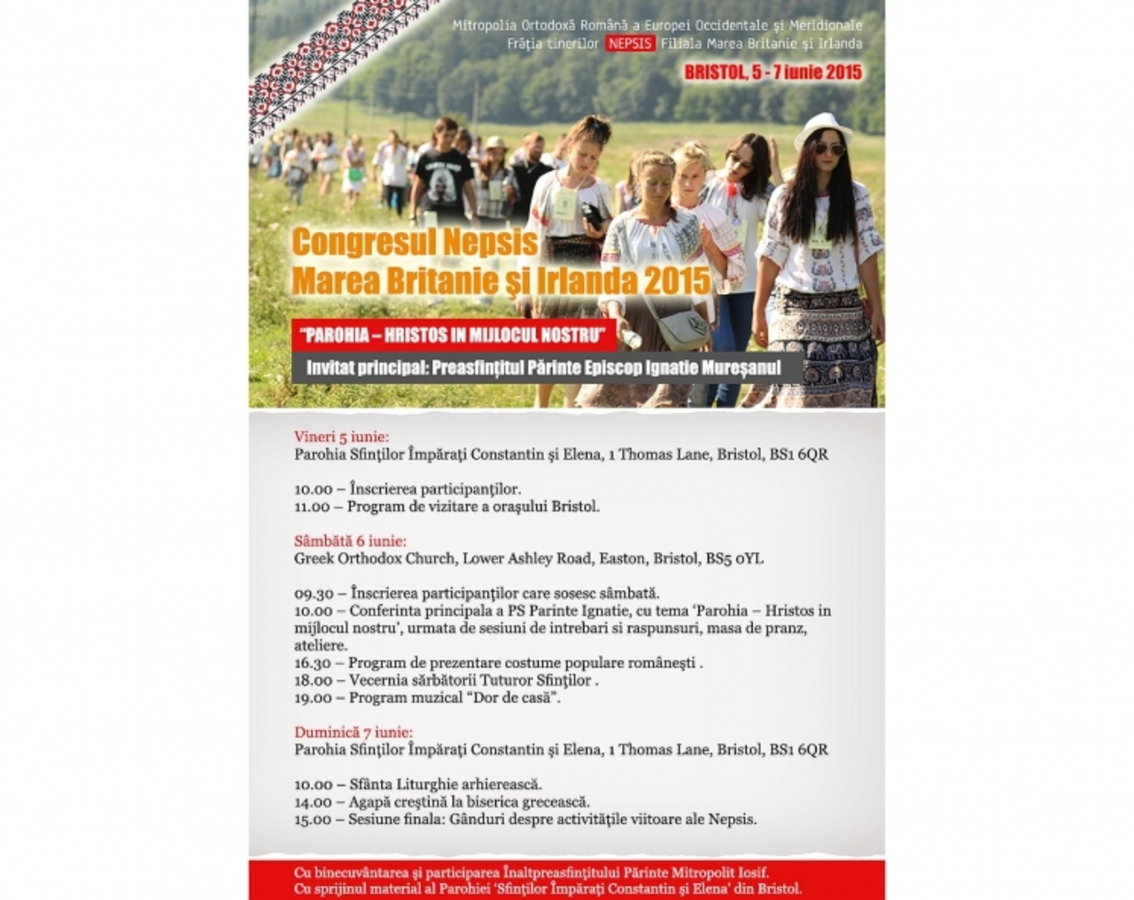 Cu binecuvântarea și din încredințarea Înaltpreasfințitului Părinte Iosif, Mitropolitul Europei Occidentale și Meridionale, în perioada 5-7 iunie 2015, a avut loc Congresul Tinerilor Nepsis, filiala Marea Britanie și Irlanda. Invitatul tinerilor a fost Preasfințitul Părinte Ignatie Mureșanul, Arhiereu-vicar al Episcopiei Ortodoxe Române a Spaniei și Portugaliei, care a susținut conferința cu tema: Parohia - Hristos în mijlocul nostru, urmată de o sesiune de întrebări și răspunsuri.