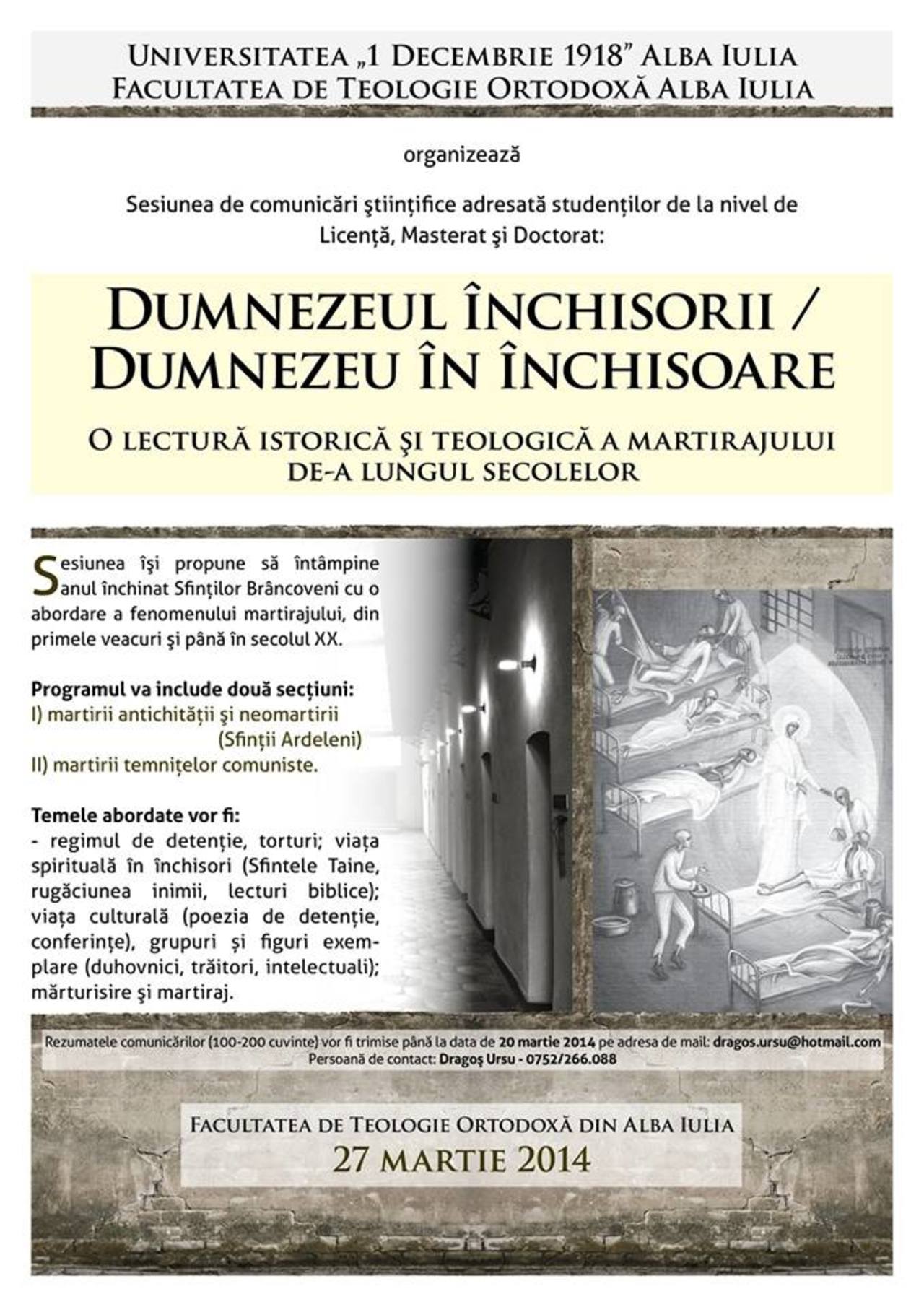 Facultatea de Teologie Ortodoxă din cadrul Universităţii „1 Decembrie 1918” Alba Iulia organizează sesiunea de comunicări ştiinţifice adresată studenţilor de la toate cele trei nivele de specializare Licenţă, Masterat şi Doctorat, intitulată „Dumnezeul închisorii / Dumnezeu în închisoare O lectură istorică şi teologică a martirajului de-a lungul secolelor”.