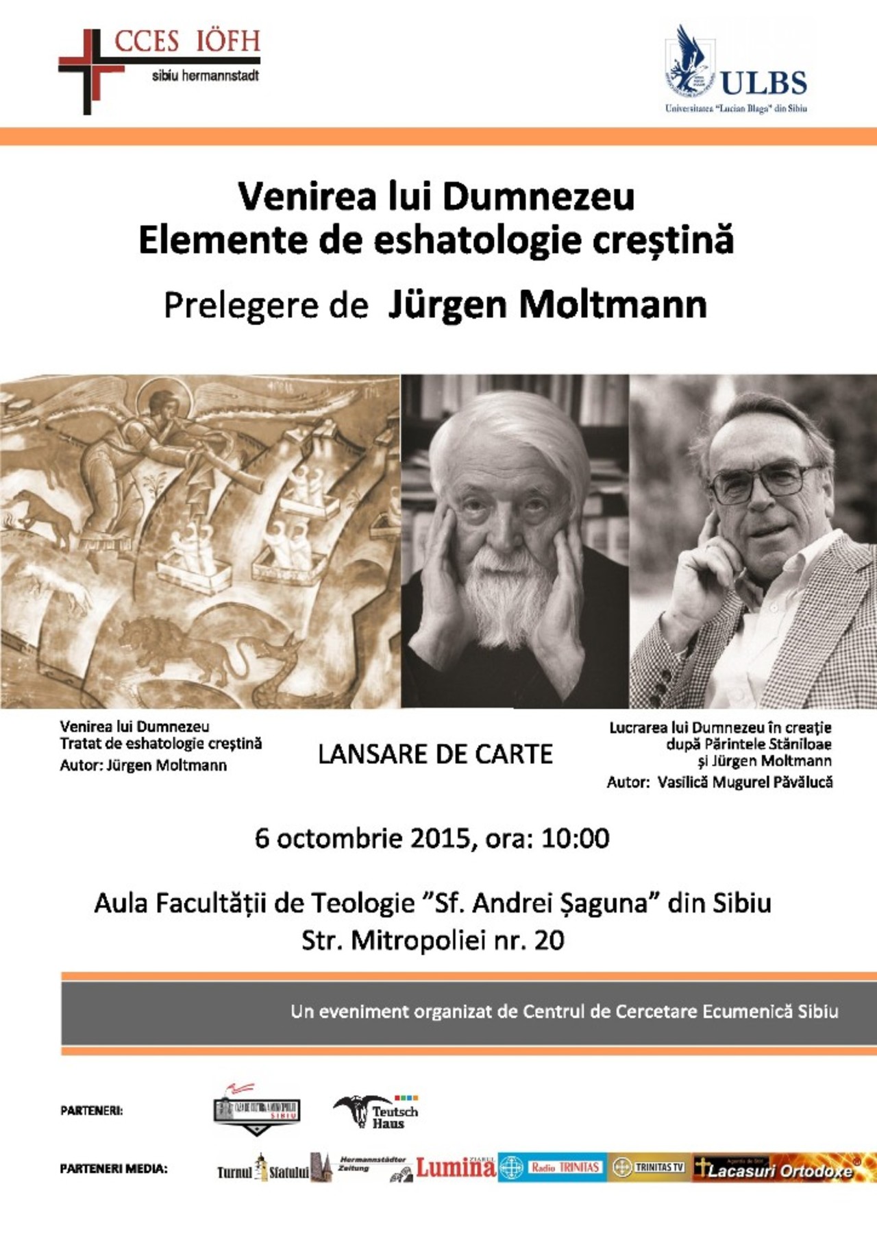 Centrul de Cercetare Ecumenică al Universității „Lucian Blaga” din Sibiu (CCES) are plăcerea de a vă invita la prelegerea susținută de prof. dr. Jürgen Moltmann – Venirea lui Dumnezeu. Elemente de eshatologie creștină. Aceasta va avea loc marți, 6 octombrie 2015, ora 10, în Aula Facultății de Teologie „Sf. Andrei Șaguna” din Sibiu.