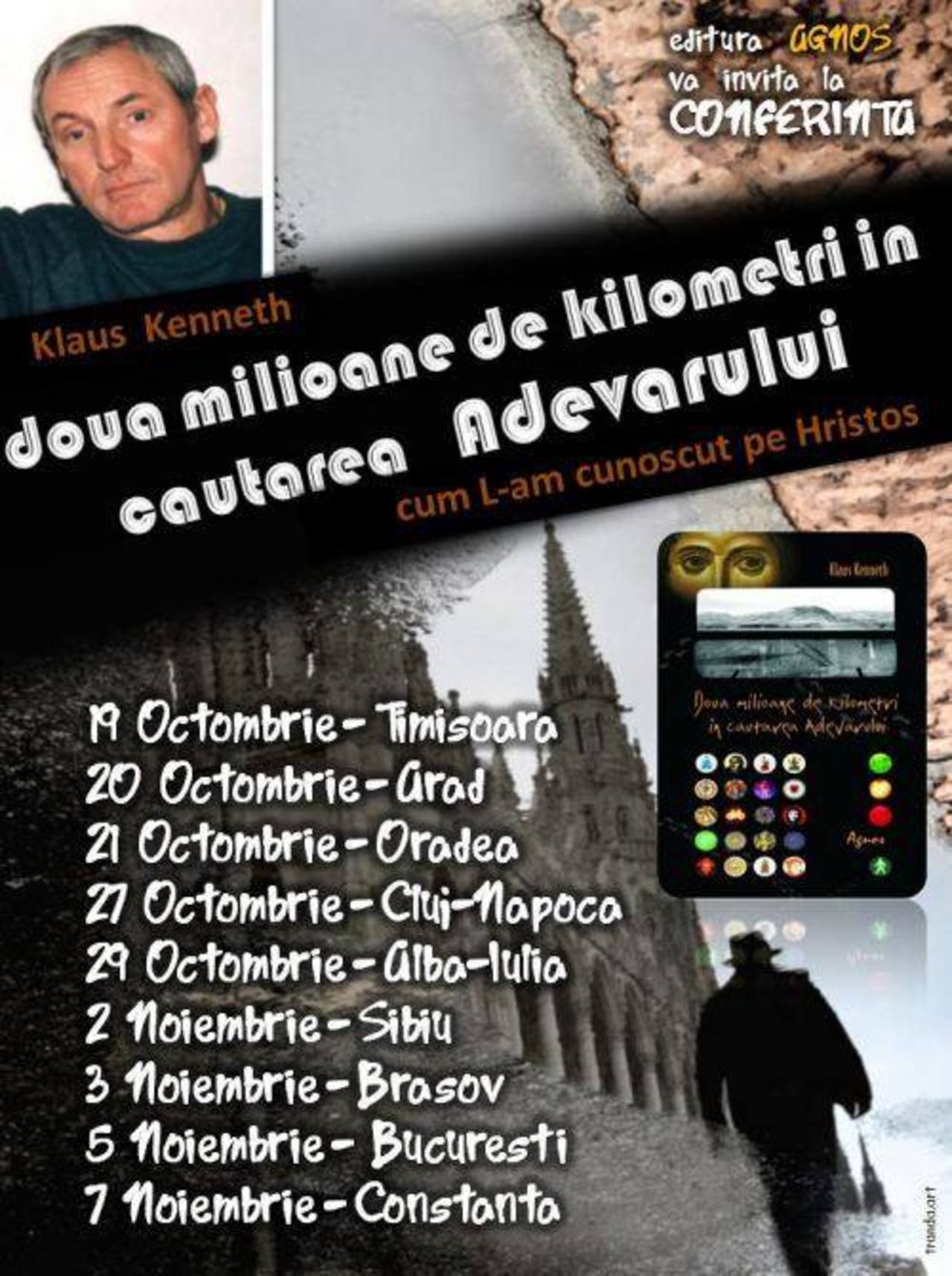 Editura Agnos a organizat la Alba Iulia conferința cu tema ”Două milioane de kilometri în căutarea adevărului- cum l-am cunoscut pe Hristos” , sustinută de domnul Klaus Kennet. Conferința s-a desfășurat joi, 29 octombrie 2015, de la ora 11.00 în aula mare ”Dumitru Stăniloae” a Facultății de Teologie Ortodoxă.