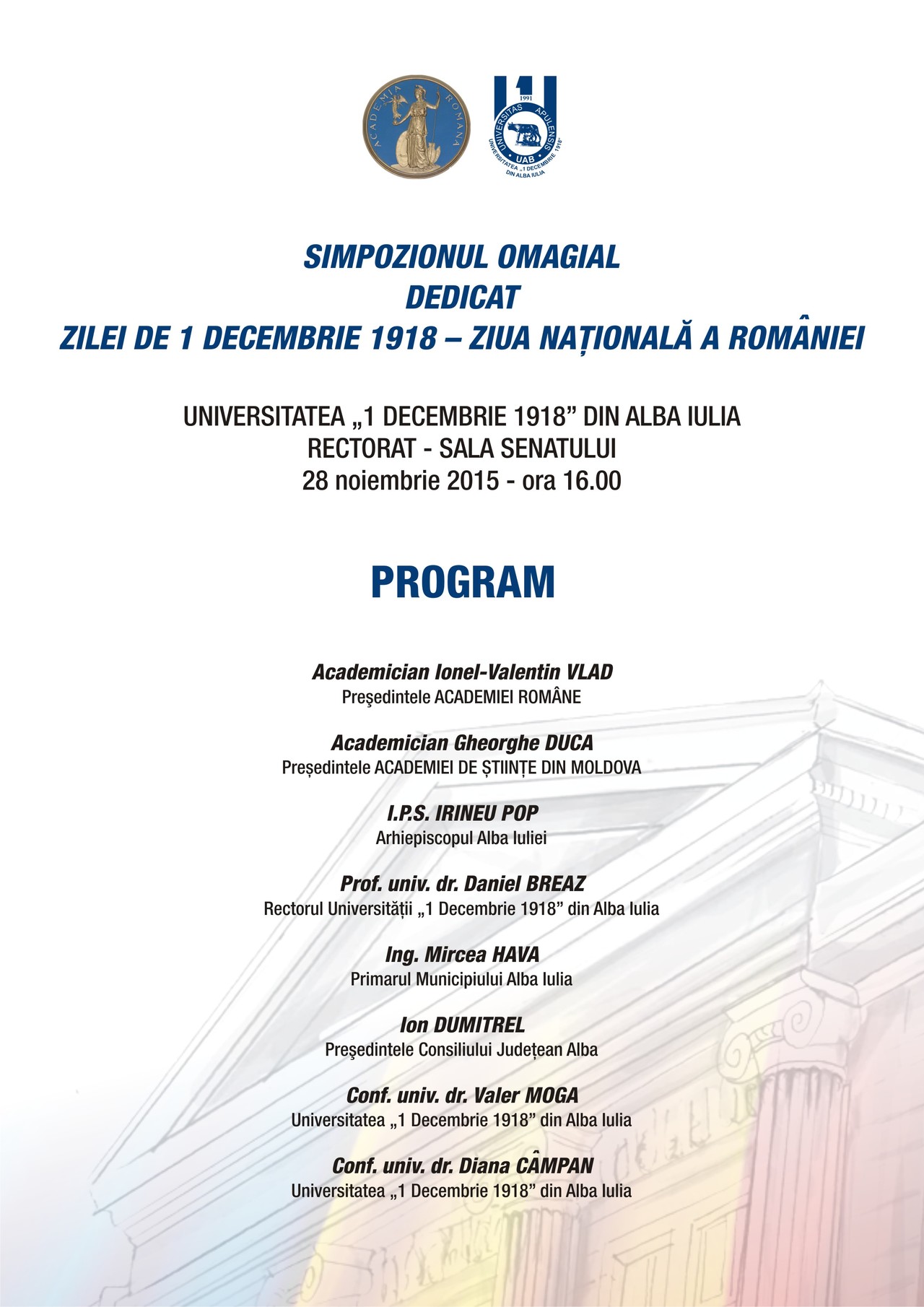 Academia Română organizează mâine, 28 noiembrie, la Universitatea „1 Decembrie 1918” din Alba Iulia Simpozionul omagial dedicat Zilei Naționale a României.Evenimentul se va desfăşura de la ora 16:00 în Sala Senatului universităţii albaiuliene.
