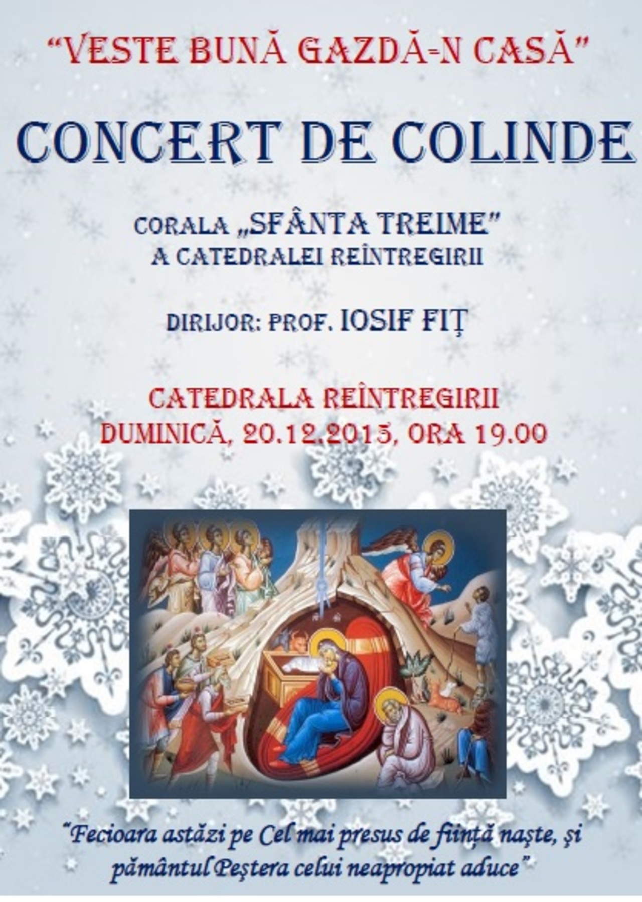 Concertul de colinde intitulat "Veste bună gazdă-n casă" a fost susţinut de corala „Sfânta Treime” a Catedralei Reîntregirii dirijată de domnul profesor Iosif Fiţ.