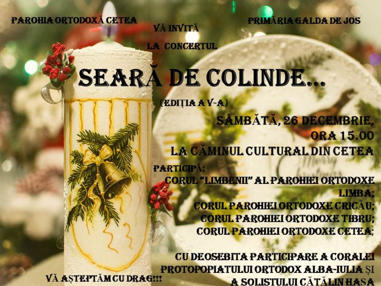 Parohia Ortodoxă Cetea şi Primăria Galda de Jos organizează mâine, 26 decembrie, de la ora 15:00, concertul intitulat „Seară de colinde…”.