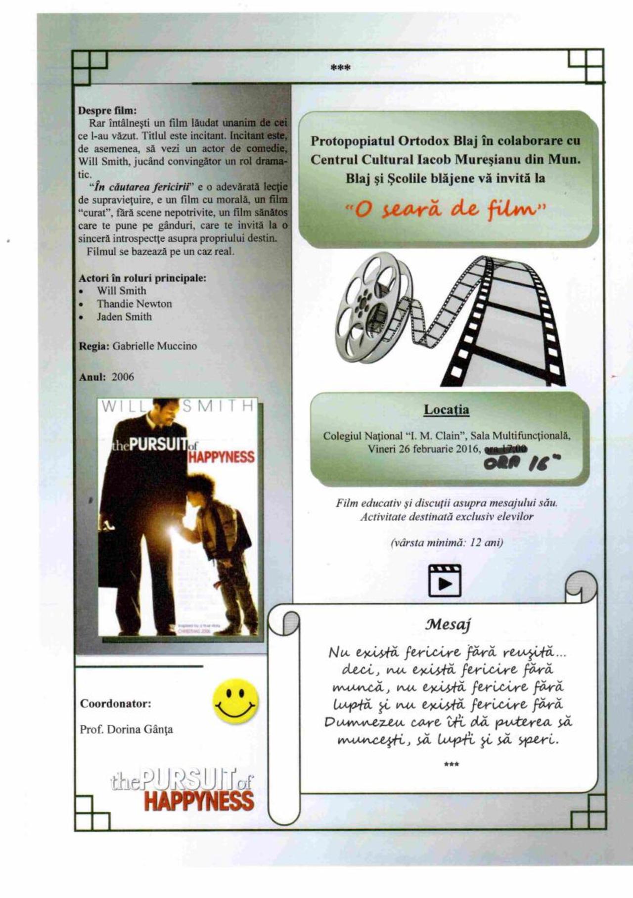 Proiectul cultural: Serile de film pentru tineri derulate în Protopopiatul ortodox Blaj sub coordonarea Grupului de inițiativă pentru tineret al Protopopiatului ortodox Blaj continuă în luna februarie prin vizionarea filmului "În căutarea fericirii"(The pursuit of happiness”). Această întâlnire va fi găzduită vineri, 26 februarie 2016, de la ora 16:00, în sala multifuncțională a colegiului I.M. Clain din Blaj, sub moderarea doamnei profesoare Dorina Gânța. Distribuția filmului îl are în rolul principal pe arhicunoscutul Will Smith, care a mai jucat roluri epice în: "Men in Black", "Wild Wild West", "Ali" sau "Independence Day".