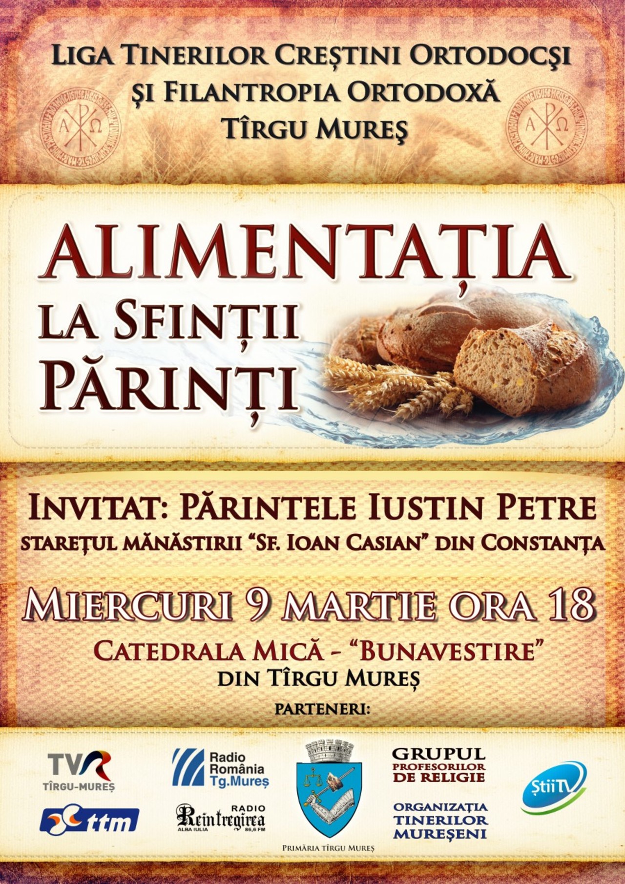 Liga Tinerilor Ortodocşi din Târgu-Mureş în parteneriat cu Filantropia Orotdoxă Târgu Mureș, preocupaţi şi de frumuseţea şi sănătatea sufletului, vor organiza mâine, 09 martie, o seară duhovnicească. Celor care vor participa li se propune o seară de suflet în cadrul căreia se vor întâlni cu Părinte Iustin Petre, starețul mănăstirii „Sfântul Ioan Casian” din Constanța şi care va susţine o prelegere duhovnicească cu titlul „Alimentația la Sfinții Părinți”.