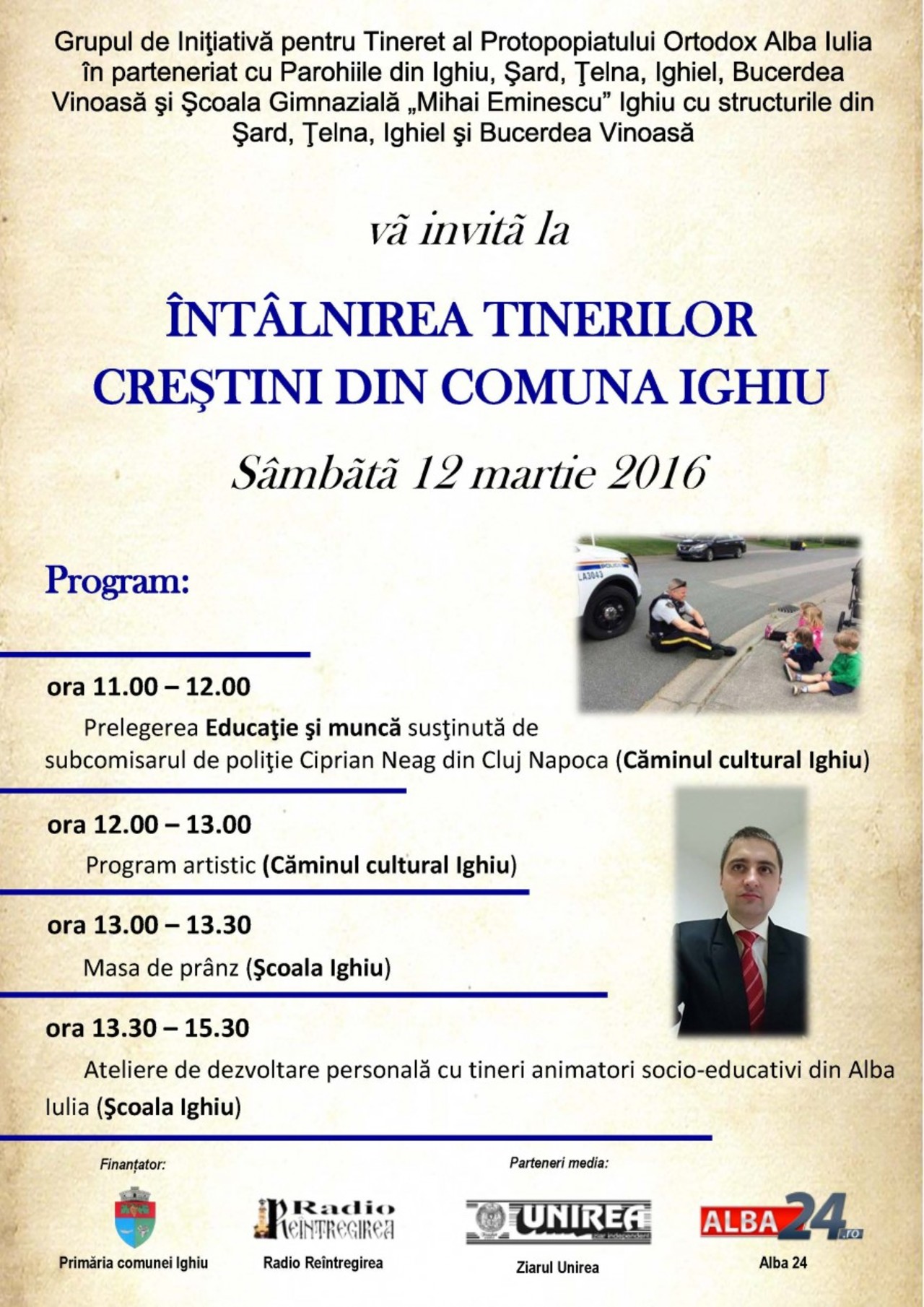 Grupul de Iniţiativă pentru Tineret al Protopopiatului Ortodox Alba Iulia în parteneriat cu Parohiile din Ighiu, Şard, Ţelna, Ighiel şi Bucerdea Vinoasă şi Şcoala Gimnazială „Mihai Eminescu” din Ighiu cu structurile din Şard, Ţelna, Ighiel şi Bucerdea Vinoasă invită tinerii de pe raza comunei Ighiu la Întâlnirea tinerilor creştini din comună.