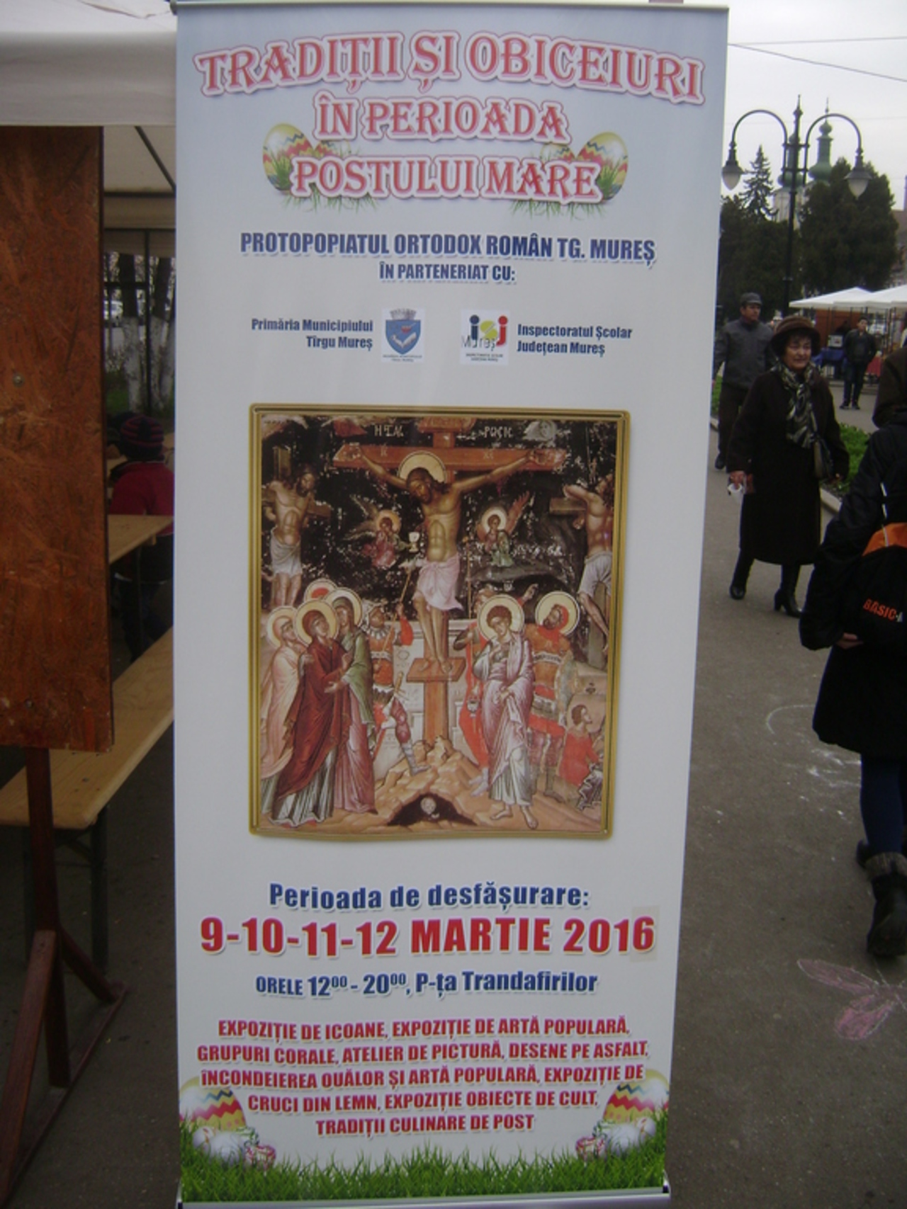 În perioada 9-12 martie, 2016, Piața Trandafirilor din Târgu Mureș a fost împodobită de frumoasele expoziții de artă creștină străbună românească și de încântătoarele creații realizate prin sincera viziune artistică a copiilor. Toate acestea s-au realizat datorită sprijinului primit din partea Protopopiatului Ortodox Târgu Mureș, a profesorilor și elevilor, a credincioșilor, a Primăriei și a inimoșilor sponsori. Standurile amenajate în centrul municipiului, au dat posibilitatea vizitatorilor să admire expoziții de icoane pictate pe coji de ouă, pe sticlă, icoane și obiecte de cult vechi, lucrări sculptate la Liceul Tehnologic,, Ion Vlasiu“, ouă încondeiate, costume populare și să guste din bucatele de post oferite de către Protopopiatul Târgu Mureș și restaurantul ,,Dona“. Copiii din școlile târgumureșene și cei din casele de tip familiar din protopopiat, au realizat picturi și desene pe asfalt, au încondeiat ouă și au cântat pricesne.