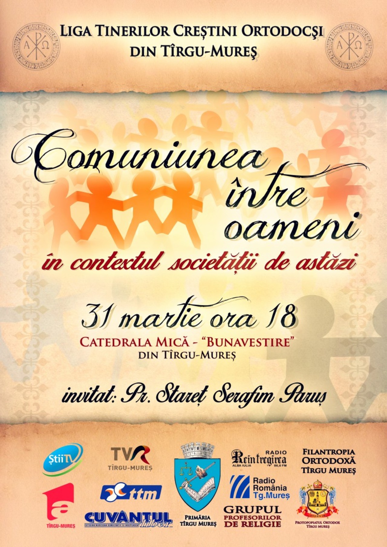 Liga Tinerilor Ortodocşi din Târgu-Mureş în parteneriat cu mai multe instituţii preocupate şi de frumuseţea şi sănătatea sufletului, vor organiza mâine, 31 martie, o seară duhovnicească. Celor care vor participa li se propune o seară de suflet în cadrul căreia se vor întâlni cu Părinte Stareţ Serafim Paruş care va susţine o prelegere duhovnicească cu titlul „Comuniunea între oameni în contextul societăţii de astăzi”.