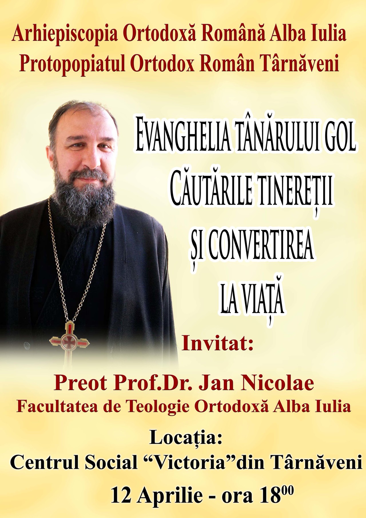 Invitat să susţină această conferinţă este Părintele Nicolae Jan, profesor la Facultatea de Teologie Ortodoxă din Alba-Iulia.