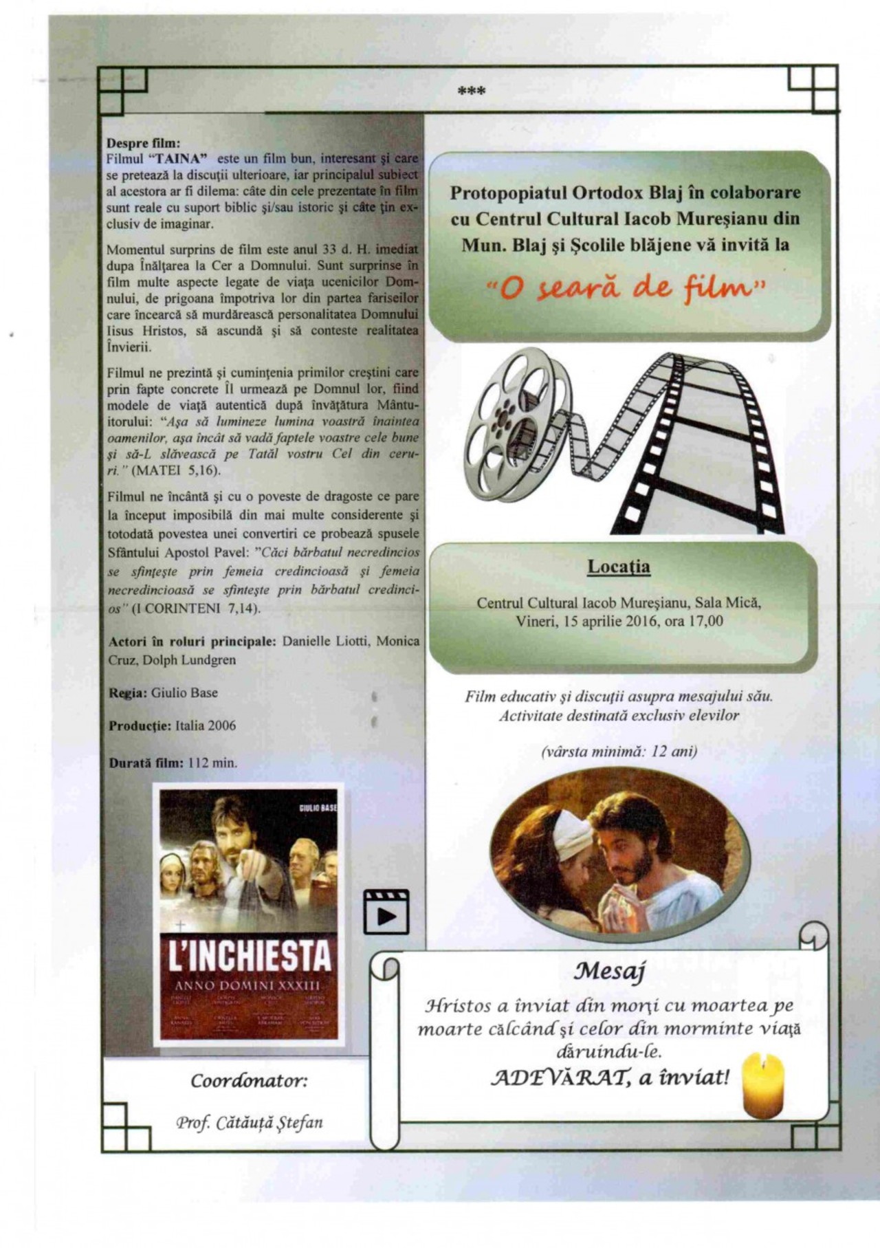 Proiectul cultural: „Seară de film pentru tineri” derulat în Protopopiatul Ortodox Blaj sub coordonarea Grupului de iniţiativă pentru tineret al Protopopiatului Ortodox continuă în luna aprilie prin vizionarea filmului „Taina” (L’INCHIESTA, Italia, 2006). Această întâlnire se va desfăşura vineri, 15 aprilie 2016, de la ora 17.00 în sala mică a Centrului Cultural Iacob Mureşianu, sub moderarea Pr. Ştefan Cătăuţă.