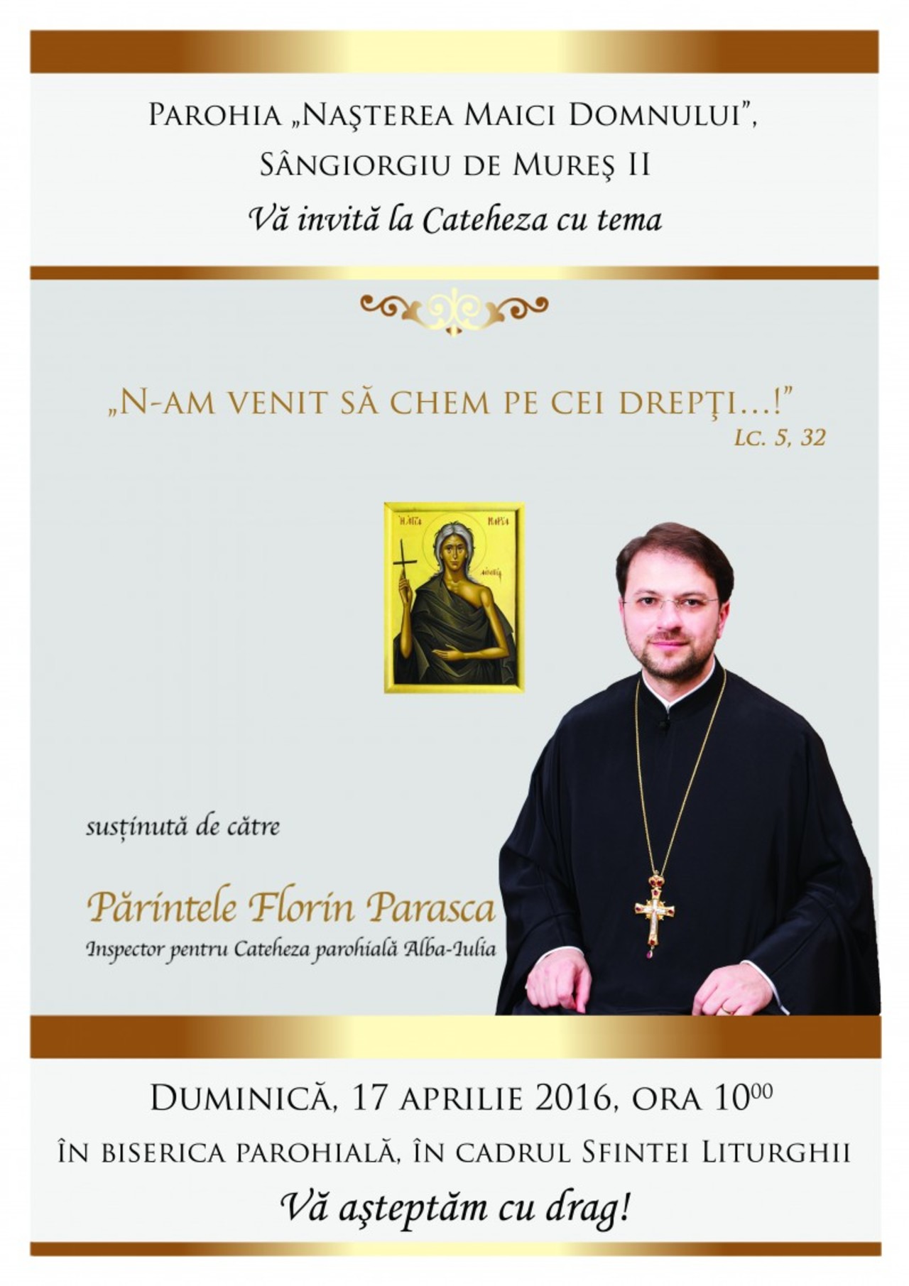 Parohia Ortodoxă „Nașterea Maicii Domnului” II din localitatea Sângiorgiu de Mureş vă invită să luaţi parte la cateheza cu tema: „N-am venit să chem pe cei drepți...!”(Luca 5,32).