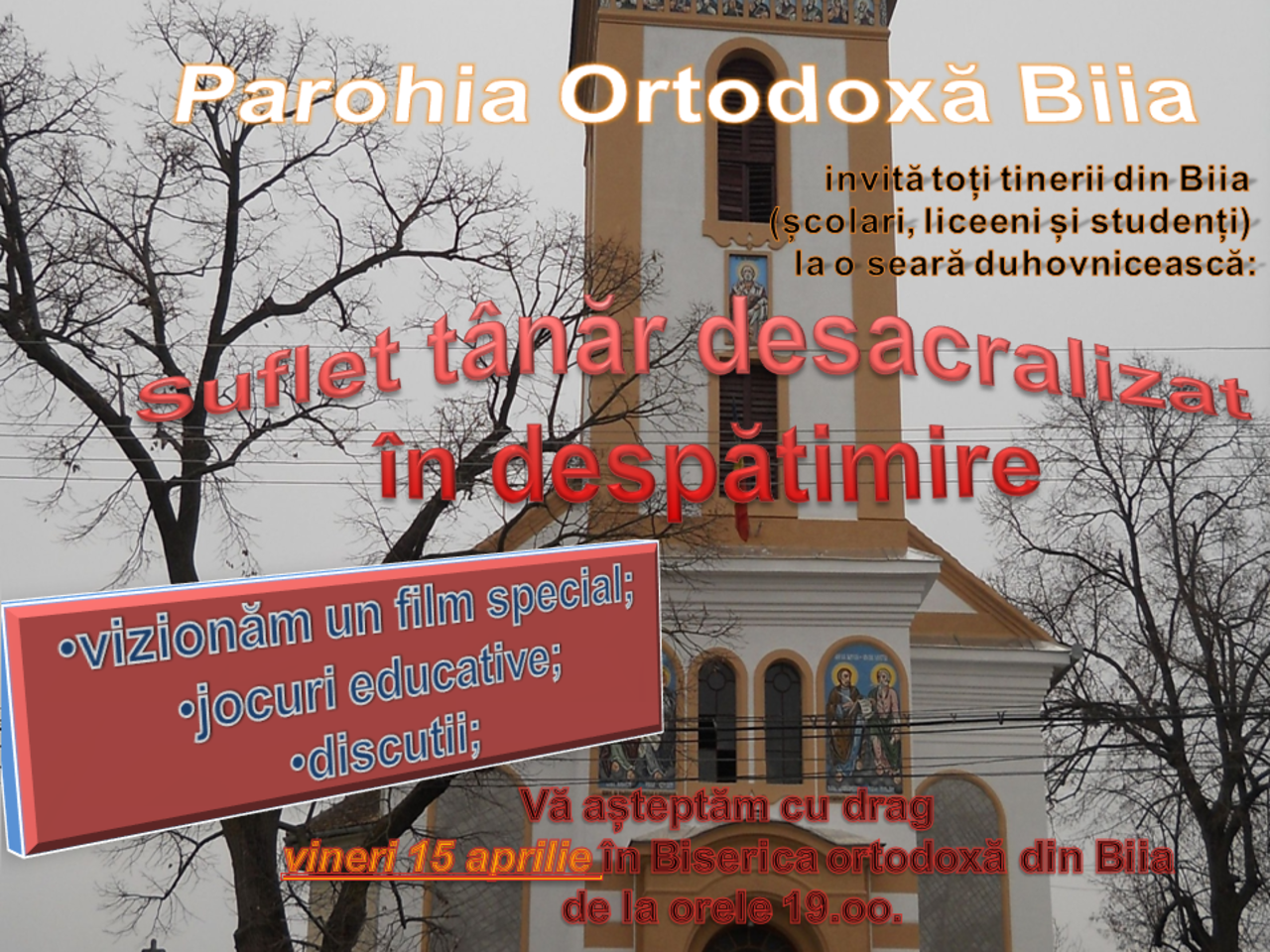 Prin ocrotirea Sf. Ierarh Nicolae, cu binecuvântarea Înalt Preasfinţitului Părinte Irineu, Arhiepiscop al Alba Iuliei şi cu sprijinul Protopopiatului Ortodox Blaj, Parohia Ortodoxă Biia organizează evenimentul cultural religios intitulat ”Suflet tânăr secularizat în despătimire”.