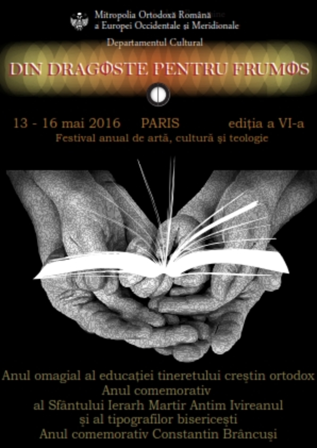 În perioada 13-16 mai a.c., în capitala franceză, se desfășoară Festivalul anual de artă, cultură și teologie intitulat „Din dragoste pentru Frumos” (Pour l'amour de la Beauté). Ajuns deja la cea de-a VI-a ediție, festivalul, care a devenit o frumoasă tradiție în viața diasporei românești, este organizat de Mitropolia Ortodoxă Română a Europei Occidentale și Meridionale (prin Sectorul Cultural), în colaborare cu Ambasada României la Paris și Institutul Cultural Român, care împreună îşi propun să aducă, prin valorile ortodoxiei, o abordare creatoare a provocărilor contemporane. Scopul principal al acestui eveniment este de a aduce în atenţia publicului iubitor de frumos, creaţii artistice impregnate de o căutare asiduă a divinului. Prin dezbaterile organizate în jurul acestora, festivalul tentează o înţelegere a modului în care omul, căutând vecinătatea absolutului, îşi sublimează formele de manifestare şi de expresie. Cultivând arta şi frumosul, aceasta propune un efort de ascuţire a sensibilităţii până la a deveni organ de cunoaştere, facilitându-ne apropierea de Dumnezeu, Creatorul şi Izvorul frumuseţii.