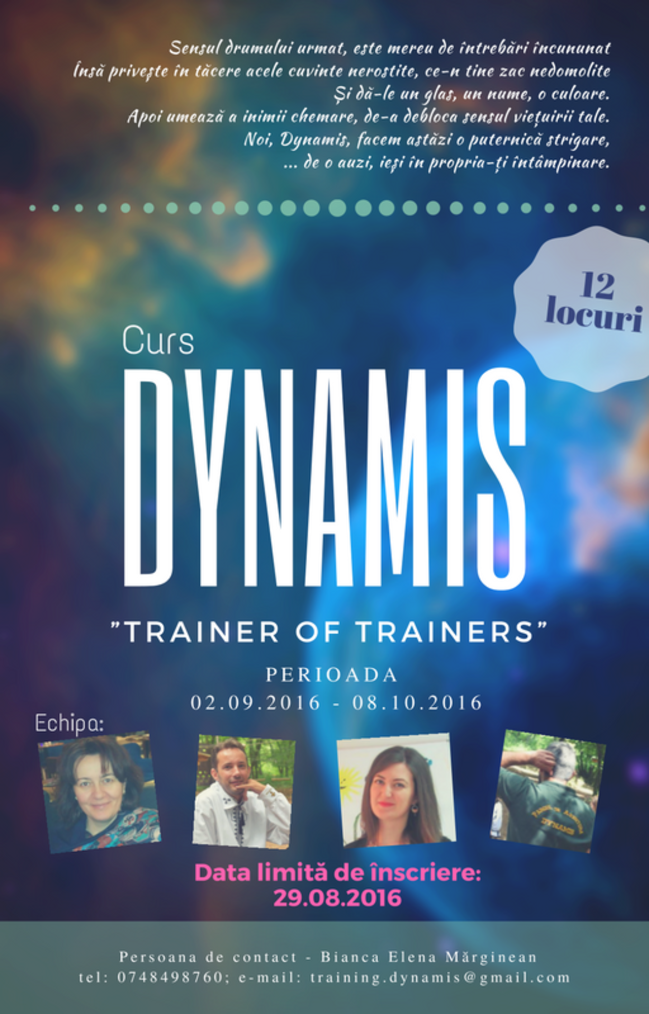 „Noi ne manifestăm curajul de a crea un nou context de învăţare, invitându-vă să participaţi la acest curs, având posibilitatea de a valorifica ulterior cele învăţate, poate chiar de a vă alătura nouă, echipei Dynamis. Acest curs se adresează tuturor persoanelor pasionate de elaborarea şi livrarea cursurilor pentru dezvoltare personală şi profesională. Nu este importantă experienţa sau domeniul profesional din care provine cursantul ci doar deschiderea de a învăţa cu adevărat. Transformăm împreună, orice limitări personale în oportunităţi de creştere, oglindind în lumină toată fiinţa.” a spus Bianca Elena Mărginean – coordonatorul Centrului de Training Dynamis din cadrul Asociaţiei Filantropia Ortodoxă Alba Iulia.
