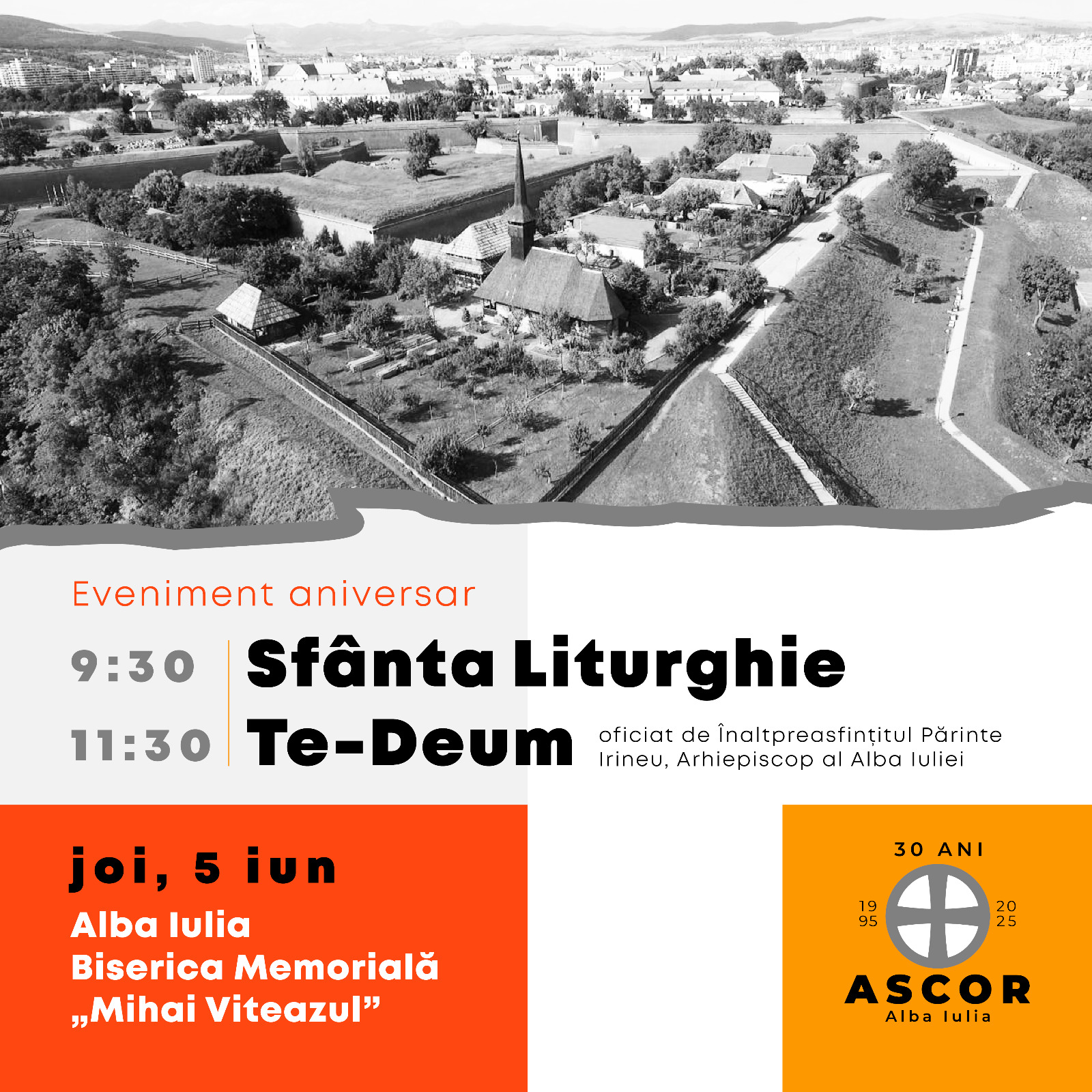 În anul 2025, Asociația Studenților Creștin-Ortodocși Români (ASCOR) – Filiala Alba Iulia sărbătorește 30 de ani de activitate. Acest popas aniversar va fi marcat în mod solemn joi, 5 iunie, la biserica memorială „Mihai Viteazul” din Alba Iulia. Începând cu ora 9.30, va fi săvârșită Dumnezeiasca Liturghie a Sfântului Ioan Gură de Aur de către un numeros sobor de clerici, în fruntea căruia se va afla părintele prof. dr. Florin Botezan, cel dintâi îndrumător duhovnicesc al ASCOR Alba Iulia.