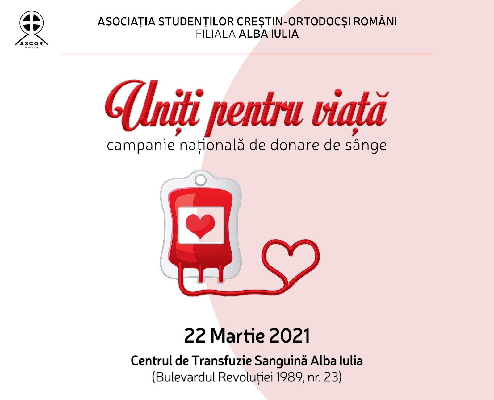 Asociația Studenților Creștin-Ortodocși Români organizează o campanie națională de donare de sânge, intitulată „Uniți pentru viață”, pentru a veni în sprijinul celor aflați în suferință.
