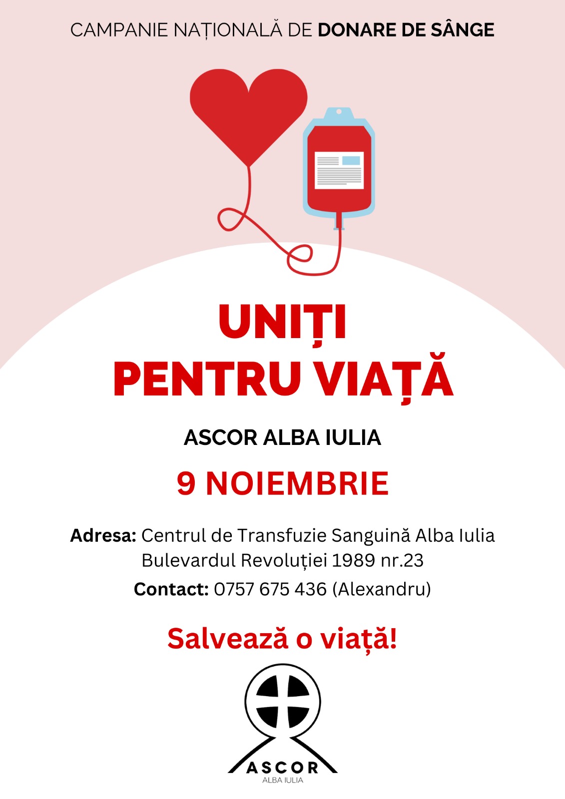 În speranţa că informaţiile prezentate mai sus v-au convins de necesitatea acestui demers umanitar, vă invităm pe cât mai mulţi dintre dumneavoastrã să vă alăturaţi campaniei noastre din data de 9 noiembrie a.c., în intervalul orar 7.30-12.00. Pentru detalii suplimentare, ne puteți contacta printr-un mesaj privat pe pagina de Facebook ASCOR Alba Iulia sau la numărul de telefon: 0757675436.