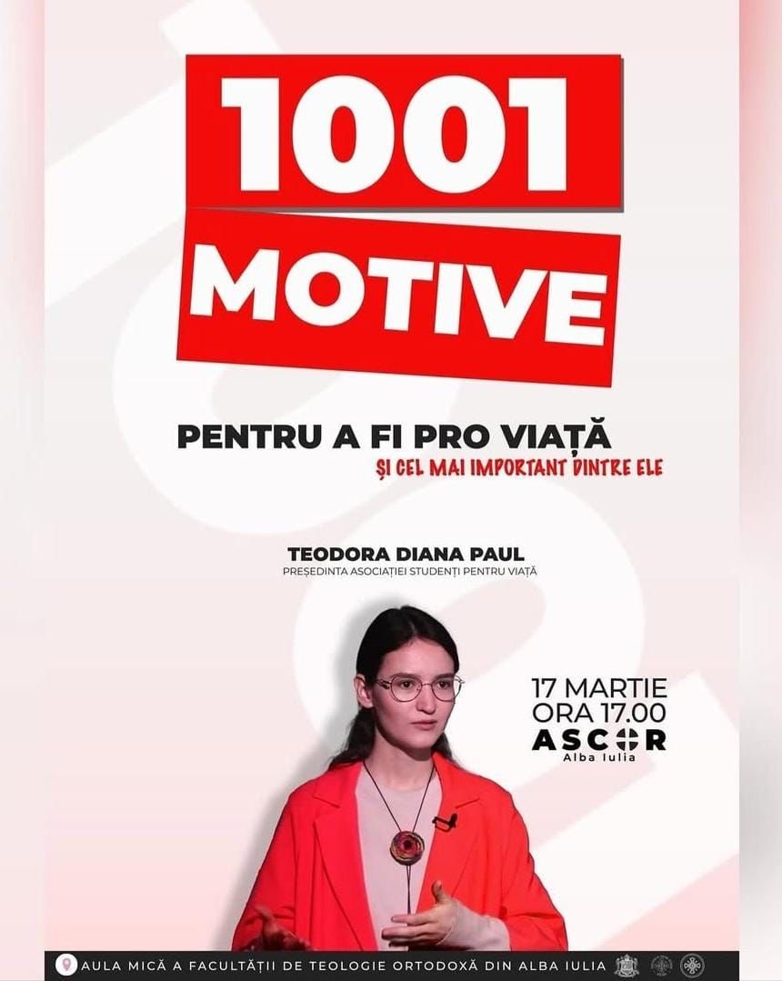 În seara zilei de luni, 17 martie 2025, Asociația Studenților Creștin-Ortodocși Români (ASCOR) – Filiala Alba Iulia a organizat primul eveniment din seria activităților pro-viață, derulate în luna martie, intitulată sugestiv „Luna pentru Viață”. Începând cu ora 17.00, în Aula „Sfântul Simion Ștefan” din incinta Facultății de Teologie Ortodoxă din Alba Iulia, a avut loc atelierul cu titlul „1001+ motive pentru a fi pro-viață și cel mai important dintre ele”, susținut de Teodora Diana Paul, președintele Asociației Studenți pentru Viață. Activitatea a reunit numeroși tineri albaiulieni, membri ai Asociației Studenților Creștin-Ortodocși Români – Filiala Alba Iulia și ai Asociației Emanoil.