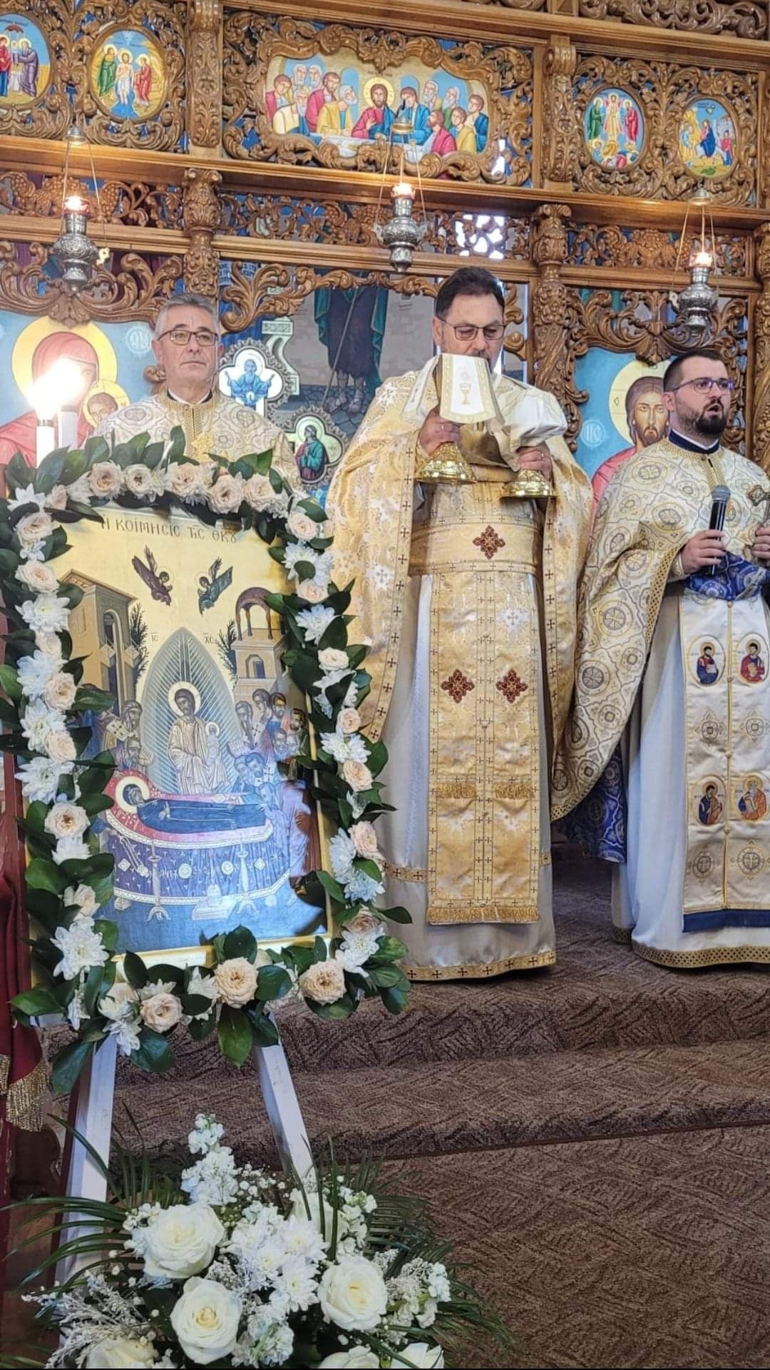 Marea sărbătoare a debutat în zorii zilei de 14 august, când biserica a devenit neîncăpătoare, credincioșii așteptând cu mare bucurie momentul Ospățului Euharistic pregătit de Însuși Mirele Vieții, Mântuitorul Iisus Hristos. Invitatul special al zilei a fost PC Pr. Marius Ciprian Pop, îndrăgitul preot și interpret de muzică populară, care a poposit în mijlocul nostru spre a încununa atmosfera festivă prin oficierea Sfintei Liturghii alături de preoții bisericii noastre, prin rostirea cuvântului de învățătură, dar și pentru a susține un recital extraordinar de pricesne închinate Maicii Domnului. În ziditorul cuvânt de învățătură, invitatul nostru a vorbit despre semnele de pocăință pe care ni le trimite Dumnezeu, despre valurile necredinței și ale păcatului, despre mijlocirea necontenită a Maicii Domnului, despre lacrimile Celei ce „e mai cinstită decât heruvimii și mai mărită fără de asemănare decât serafimii”, dar și despre îndatoririle noastre de fii ai Maicii Domnului.
