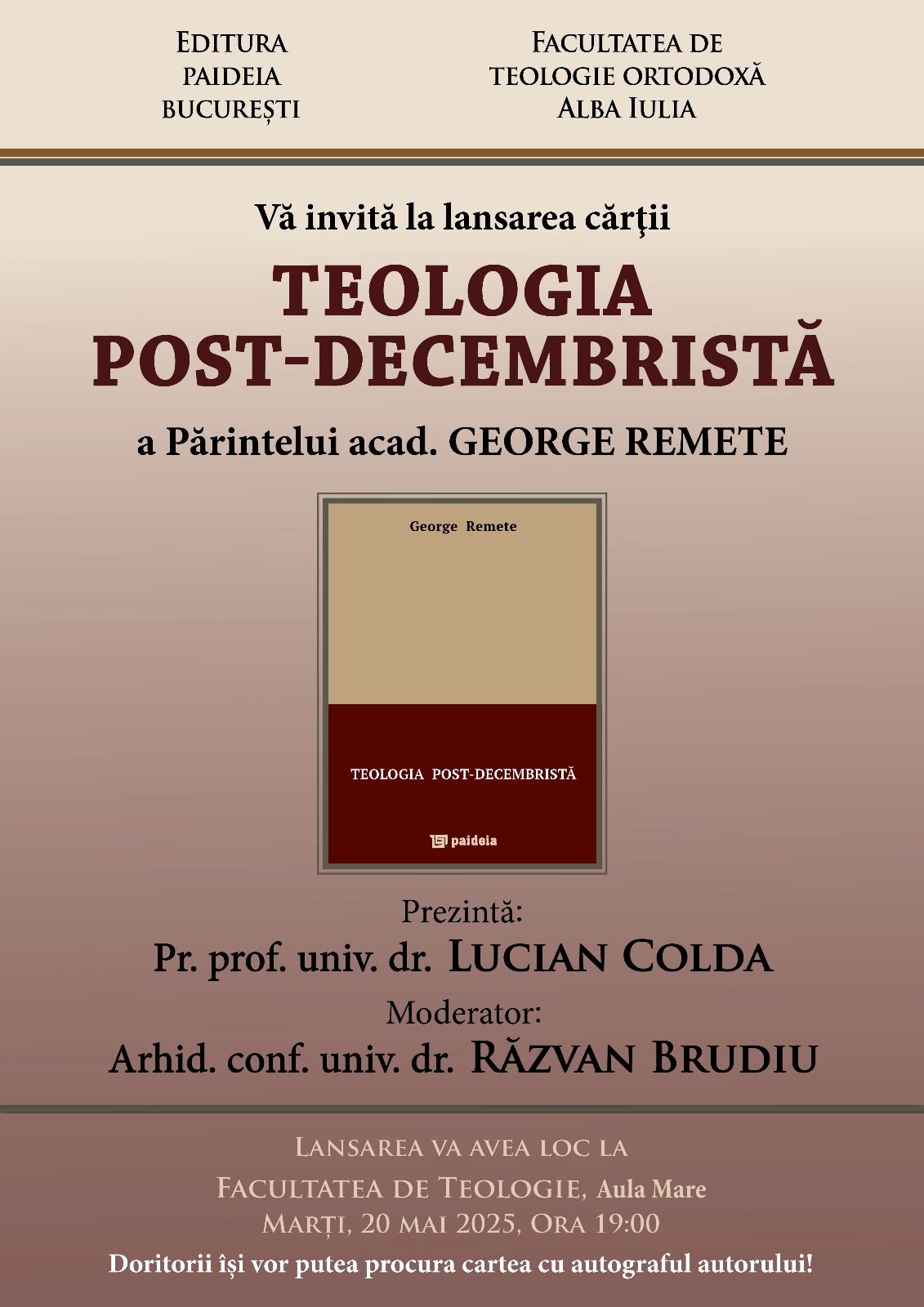 În seara zilei de marți, 20 mai 2025, la Facultatea de Teologie Ortodoxă din Alba Iulia, va avea loc lansarea cărții cu titlul „Teologia post-decembristă”, semnate de părintele academician George Remete. Evenimentul se va desfășura începând cu ora 19.00, în Aula Mare „Dumitru Stăniloae” din incinta instituției de învățământ universitar, și va fi moderat de către arhid. conf. univ. dr. Răzvan Brudiu, cadru didactic universitar la Facultatea de Teologie Ortodoxă din vechea Cetate a Bălgradului. Lucrarea va fi prezentată de părintele prof. univ. dr. Lucian D. Colda, titularul catedrei de Patrologie din cadrul aceleiași instituții de învățământ.