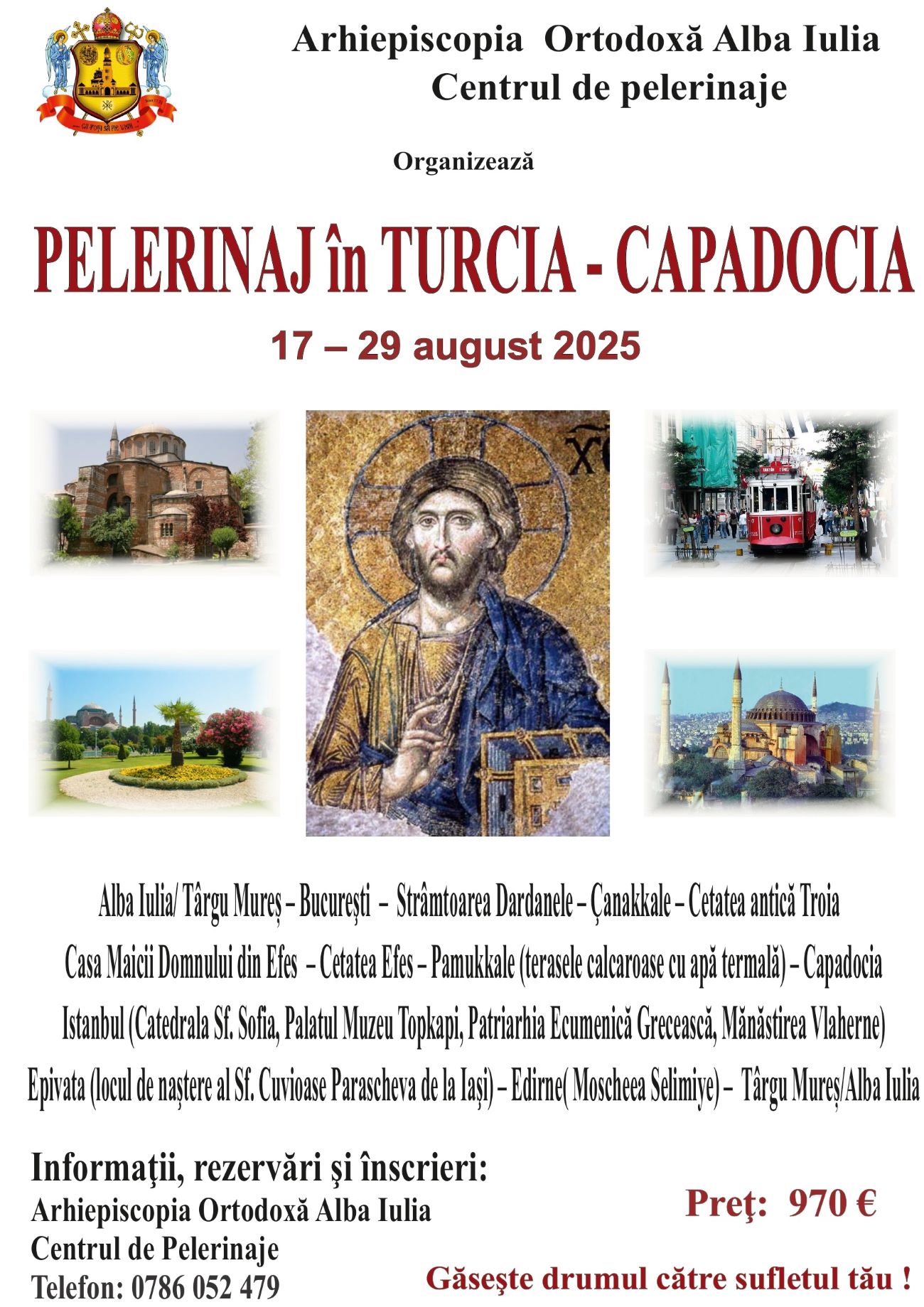 În intervalul 17-29 august 2025, Centrul de Pelerinaje al Arhiepiscopiei Alba Iuliei propune un nou itinerariu cultural-spiritual și duhovnicesc, de această dată în Turcia, țară care nu este doar o punte între Europa și Asia, ci și un spațiu sacru străbătut de Sfinții Apostoli. În acest pelerinaj, credincioșii vor retrăi istoria credinței, de la țărmul Mării Egee și al Bosforului și până în inima Capadociei.