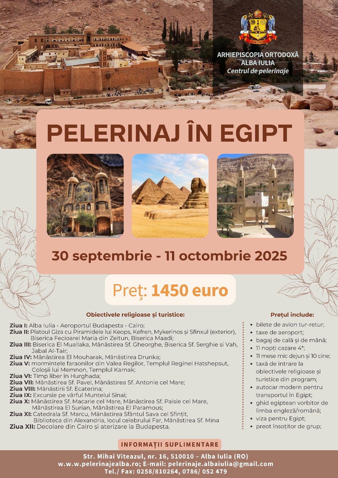 În perioada 30 septembrie - 11 octombrie 2025, Centrul de Pelerinaje al Arhiepiscopiei Ortodoxe a Alba Iuliei propune un itinerariu spiritual în Egipt. Credincioșii vor avea ocazia să viziteze locuri încărcate de istorie și har, unde Sfânta Familie a găsit adăpost, iar monahismul creștin și-a dobândit rădăcinile. Fiecare peisaj va genera o experiență unică, pentru a îmbina călătoria culturală cu cea duhovnicească. Credincioșii vor străbate orașe milenare, așezăminte monahale care adăpostesc sfinte moaște și peisaje de neuitat, într-un tărâm al sfințeniei, al misterelor antice și al credinței care au străbătut milenii.
