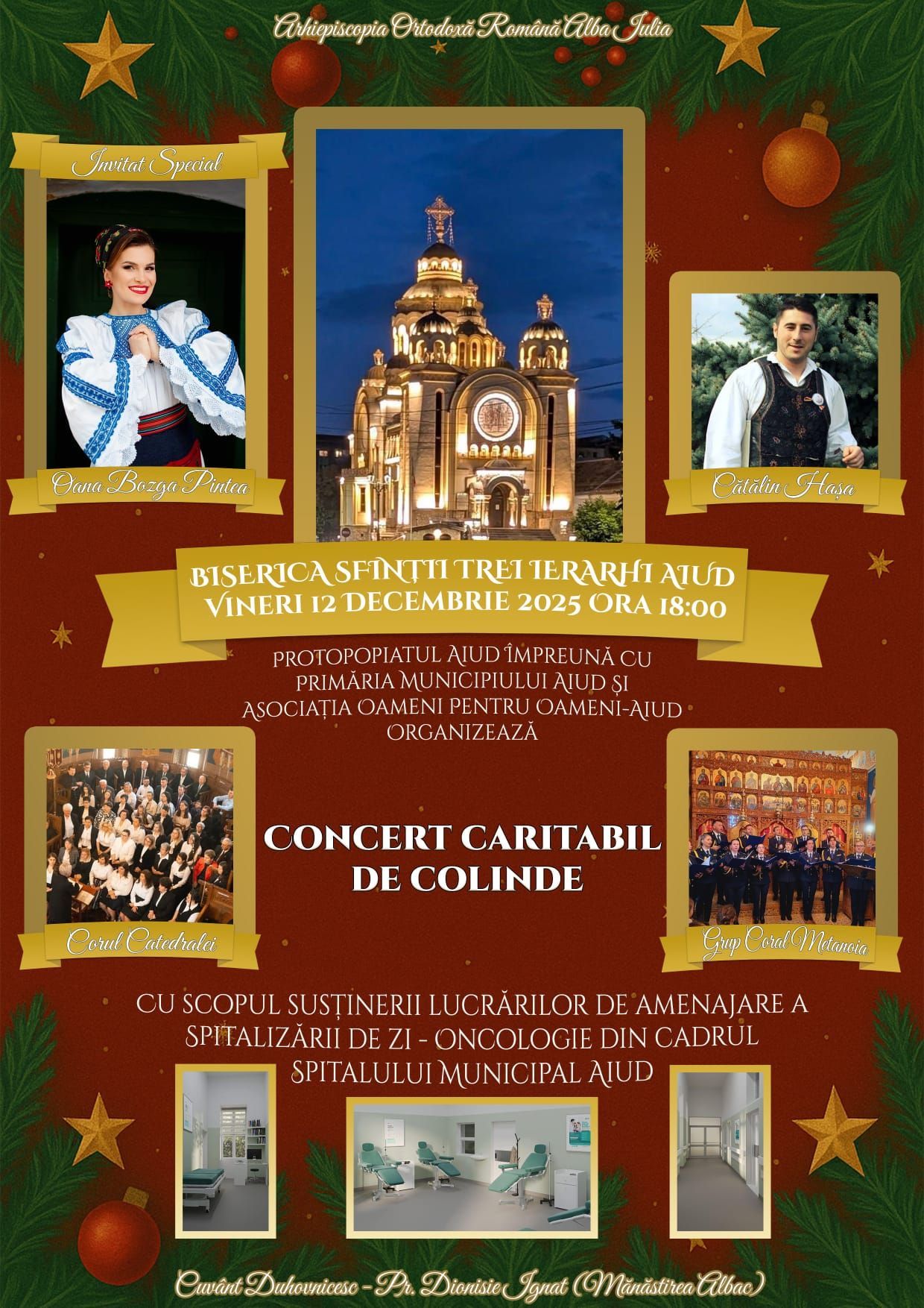 Cu binecuvântarea Înaltpreasfințitului Părinte Irineu, Arhiepiscop al Alba Iuliei, în seara zilei de vineri, 12 decembrie 2025, Parohia Ortodoxă Aiud II va organiza un concert de colinde în scop caritabil. Evenimentul va avea loc începând cu ora 18.00, la biserica parohială cu hramul „Sfinții Trei Ierarhi” din municipiul Aiud. Vor încânta sufletele celor prezenți, prin colindul străbun, Corul Parohiei Ortodoxe Aiud II, Corul Penitenciarului de Maximă Siguranță Aiud, precum și îndrăgiții interpreți Oana Bozga Pintea și Cătălin Hașa. Bucuria duhovnicească va fi sporită de părintele arhimandrit Dionisie Ignat, duhovnicul Mănăstirii „Sfântul Proroc Ilie Tesviteanul” de la Albac, care va rosti un cuvânt duhovnicesc.