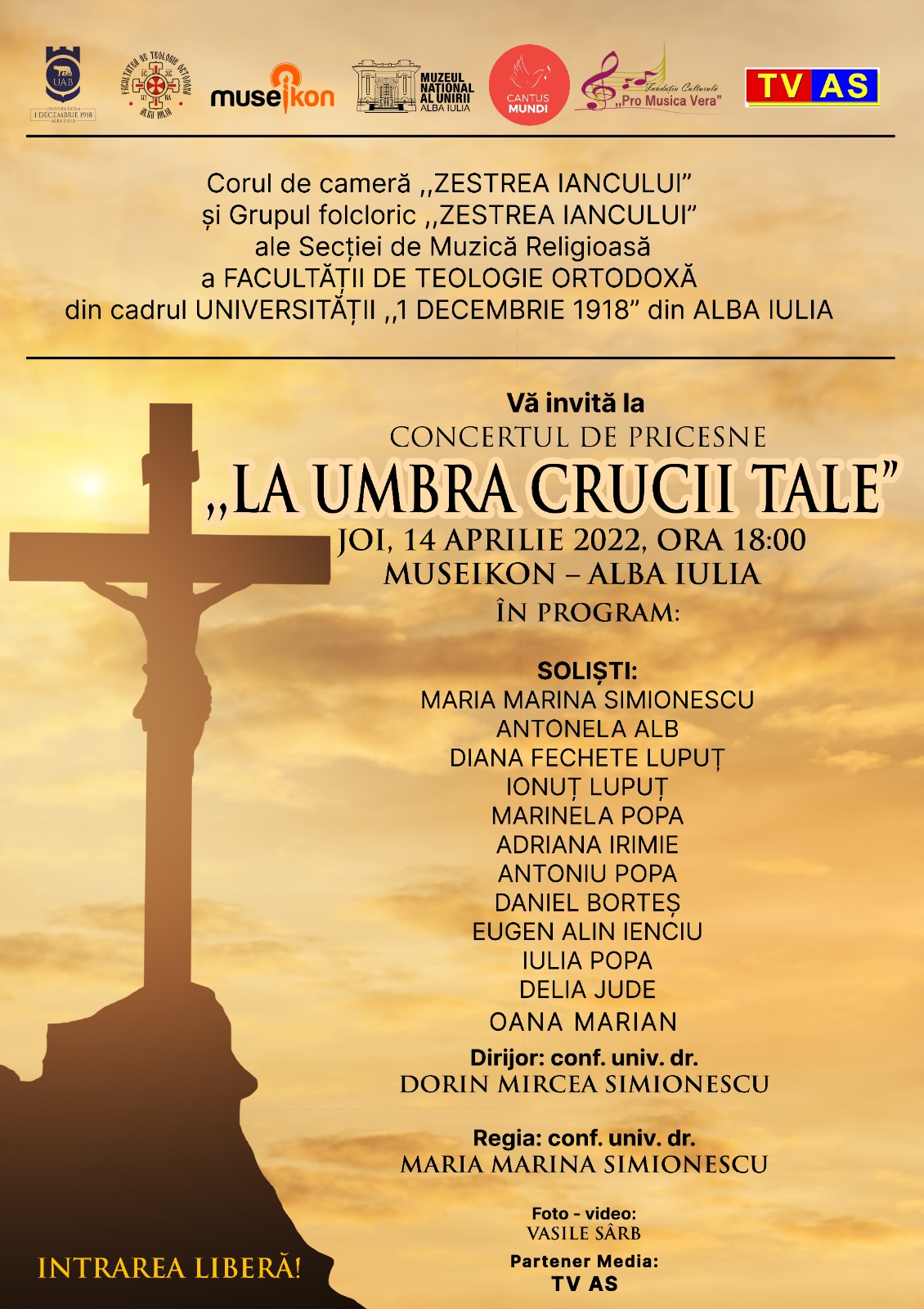 Facultatea de Teologie Ortodoxă din Alba Iulia, prin Corul de Cameră „Zestrea Iancului” și Grupul folcloric „Zestrea Iancului” ale Secției de Muzică Religioasă, organizează concertul de pricesne „La umbra Crucii Tale”. Evenimentul, aflat sub regia conf. univ. dr. Maria Marina Simionescu, se va desfășura joi, 14 aprilie 2022, începând cu ora 18.00, la Muzeul de icoană și carte veche din Alba Iulia, Museikon, intrarea fiind liberă. Programul manifestării include mai mulți soliști, studenți și profesori ai instituției de învățământ bălgrădene, dirijați de conf. univ. dr. Dorin Mircea Simionescu.