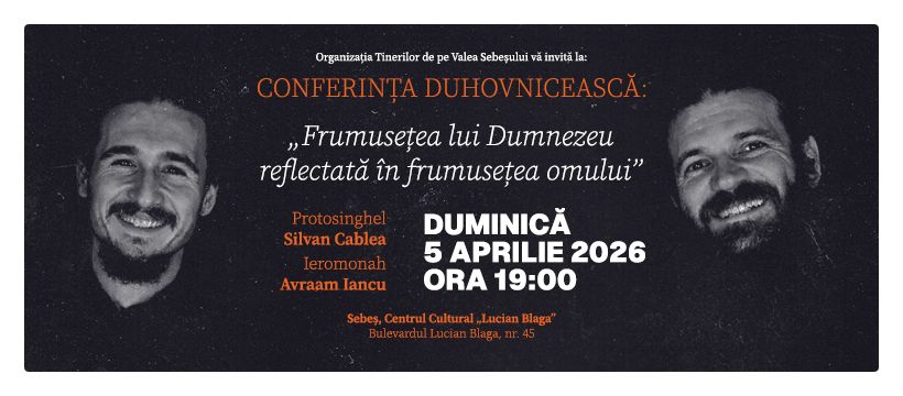 Organizația Tinerilor de pe Valea Sebeșului, alături de Centrul Cultural „Lucian Blaga” Sebeș, organizează o seară de suflet, de reflecție și de întâlnire cu sensul profund al frumuseții adevărate, în cadrul conferinței duhovnicești așezate sub genericul „Frumusețea lui Dumnezeu reflectată în frumusețea omului”. Întâlnirea va avea loc duminică, 5 aprilie 2026, la ora 19.00, în sala de evenimente a Centrului Cultural „Lucian Blaga” din Sebeș.
