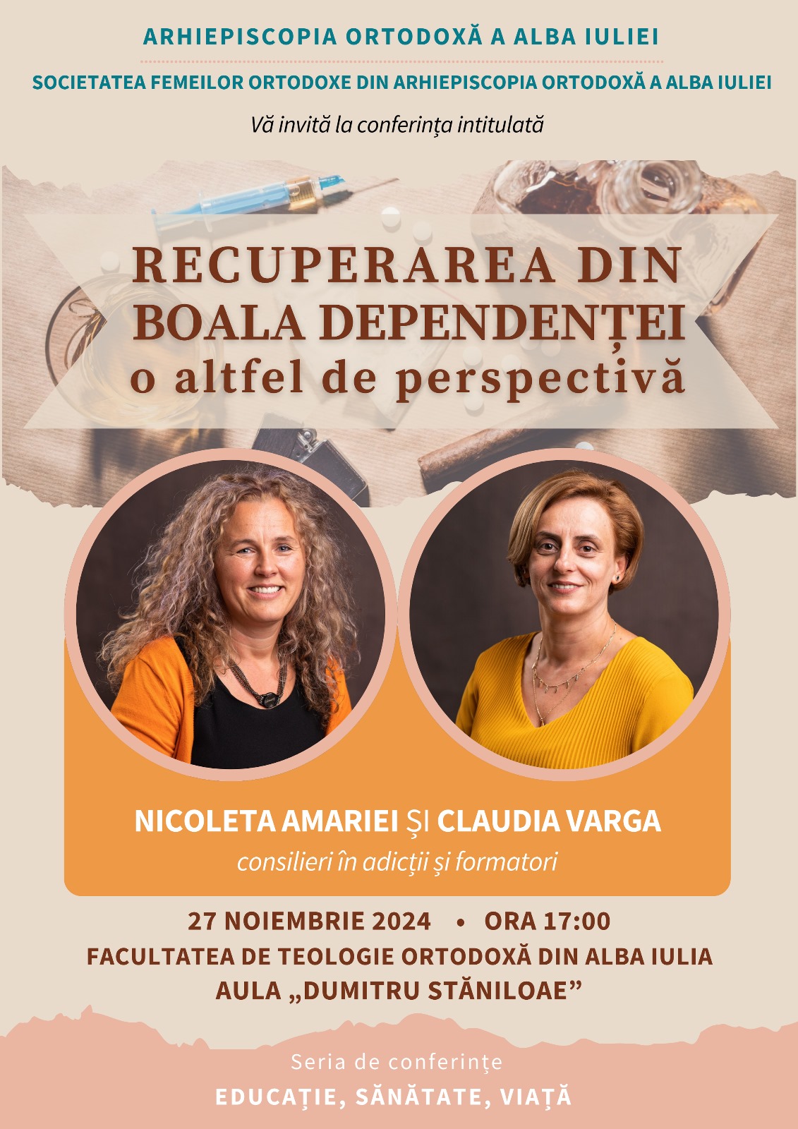 Miercuri, 27 noiembrie 2024, Societatea Femeilor Ortodoxe din Arhiepiscopia Alba Iuliei organizează un nou eveniment cultural, sub genericul „Recuperarea din boala dependenței – o altfel de perspectivă”. Manifestarea se va desfășura în Aula Mare „Dumitru Stăniloae” din incinta Facultății de Teologie Ortodoxă din Alba Iulia, începând cu ora 17.00. Scopul întâlnirii este acela de a veni în sprijinul persoanelor de toate vârstele, care se confruntă cu diferite adicții sau provocări ale vieții.