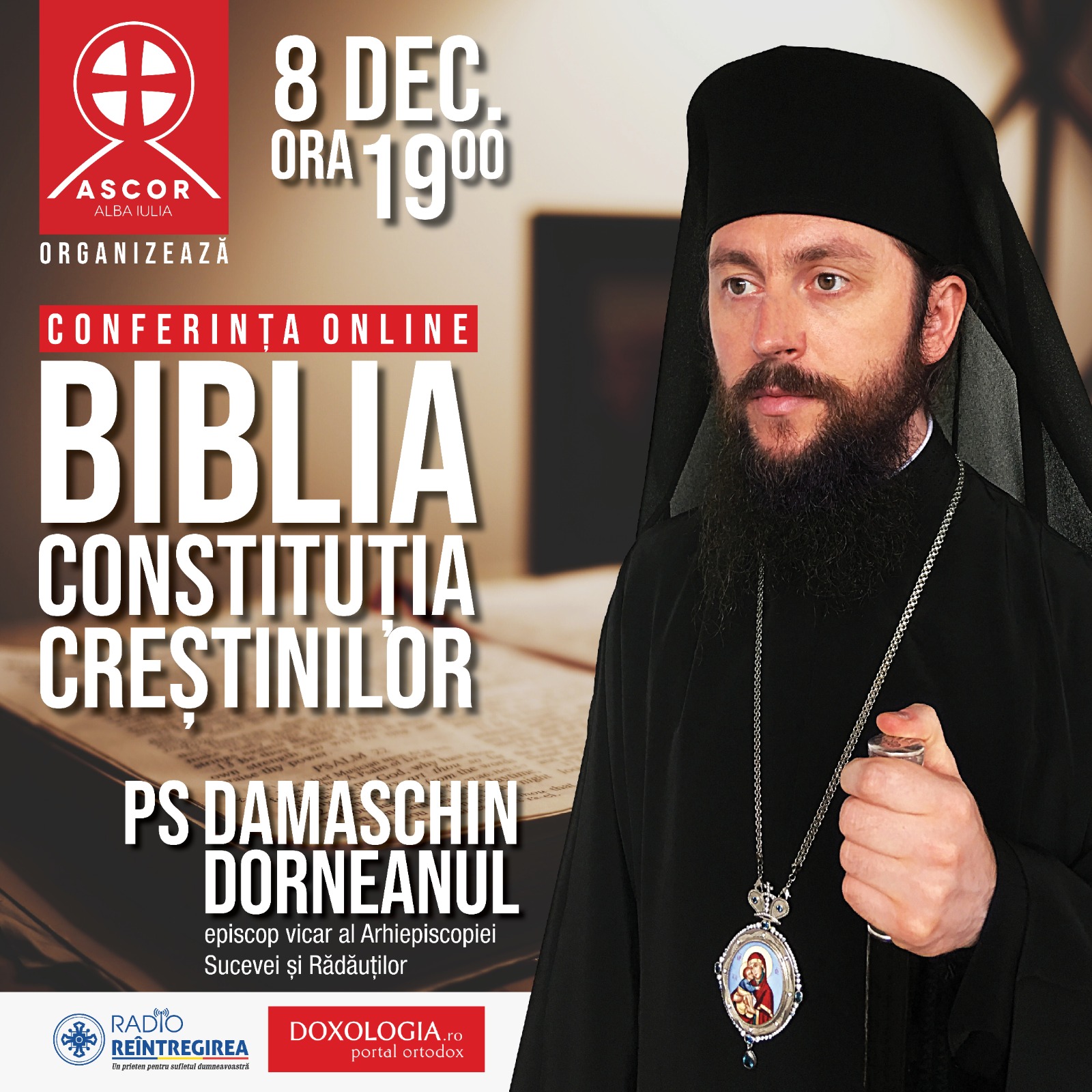 Marți, 08 decembrie 2020, începând cu ora 19:00, Preasfințitul Părinte Damaschin Dorneanul, episcopul vicar al Arhiepiscopiei Sucevei și Rădăuților, va susține conferința „Biblia – constituția creștinilor”, organizată de Asociația Studenților Creștini Ortodocși Români – filiala Alba Iulia. Evenimentul va fi transmis live pe paginile oficiale de facebook ale Arhiepiscopiei Alba Iuliei, Doxologia, ASCOR Alba Iulia, Radio Reîntregirea și pe pagina de Youtube Doxologia.