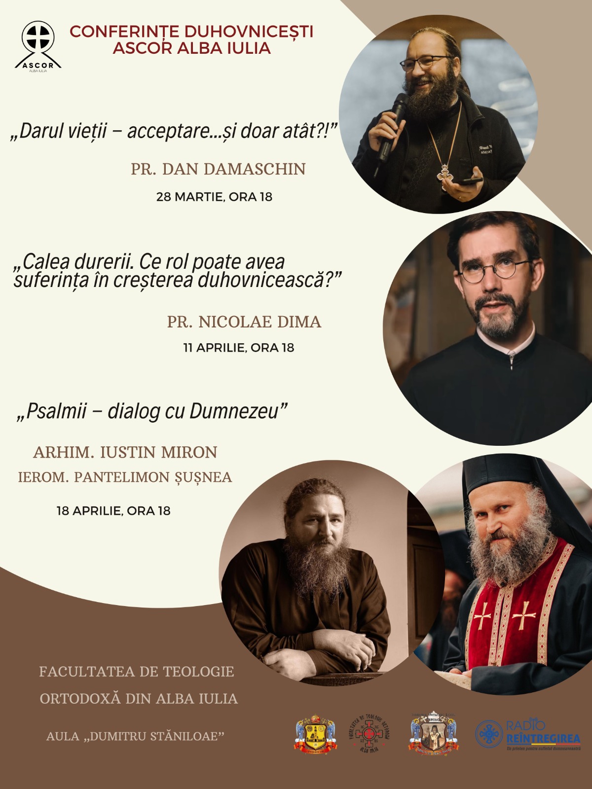 Cu binecuvântarea Înaltpreasfințitului Părinte Irineu, Arhiepiscop al Alba Iuliei, în perioada Postului Sfintelor Paști, Asociația Studenților Creștin-Ortodocși Români (ASCOR) – Filiala Alba Iulia organizează, ca în fiecare an, o serie de conferințe duhovnicești. Întâlnirile se vor derula în Aula Mare „Dumitru Stăniloae” din incinta Facultății de Teologie Ortodoxă din Alba Iulia și vor fi susținute de renumiți clerici din țara noastră.