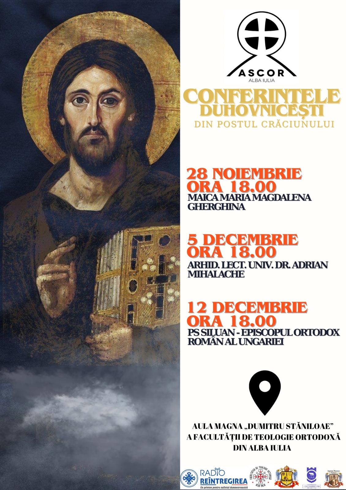Cu binecuvântarea Înaltpreasfințitului Părinte Arhiepiscop Irineu, în perioada Postului Nașterii Domnului, Asociația Studenților Creștin-Ortodocși Români (ASCOR) – Filiala Alba Iulia organizează o serie de conferințe duhovnicești. Întâlnirile vor avea loc în Aula Mare „Dumitru Stăniloae” din incinta Facultății de Teologie Ortodoxă din Alba Iulia, în zilele de 28 noiembrie, 5 decembrie și 12 decembrie a.c.