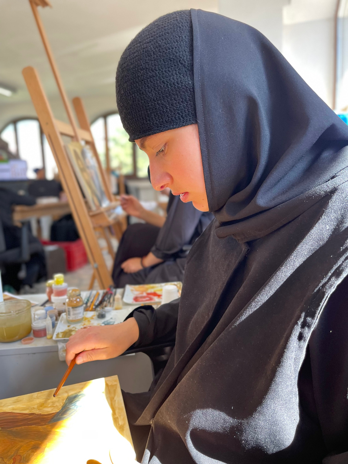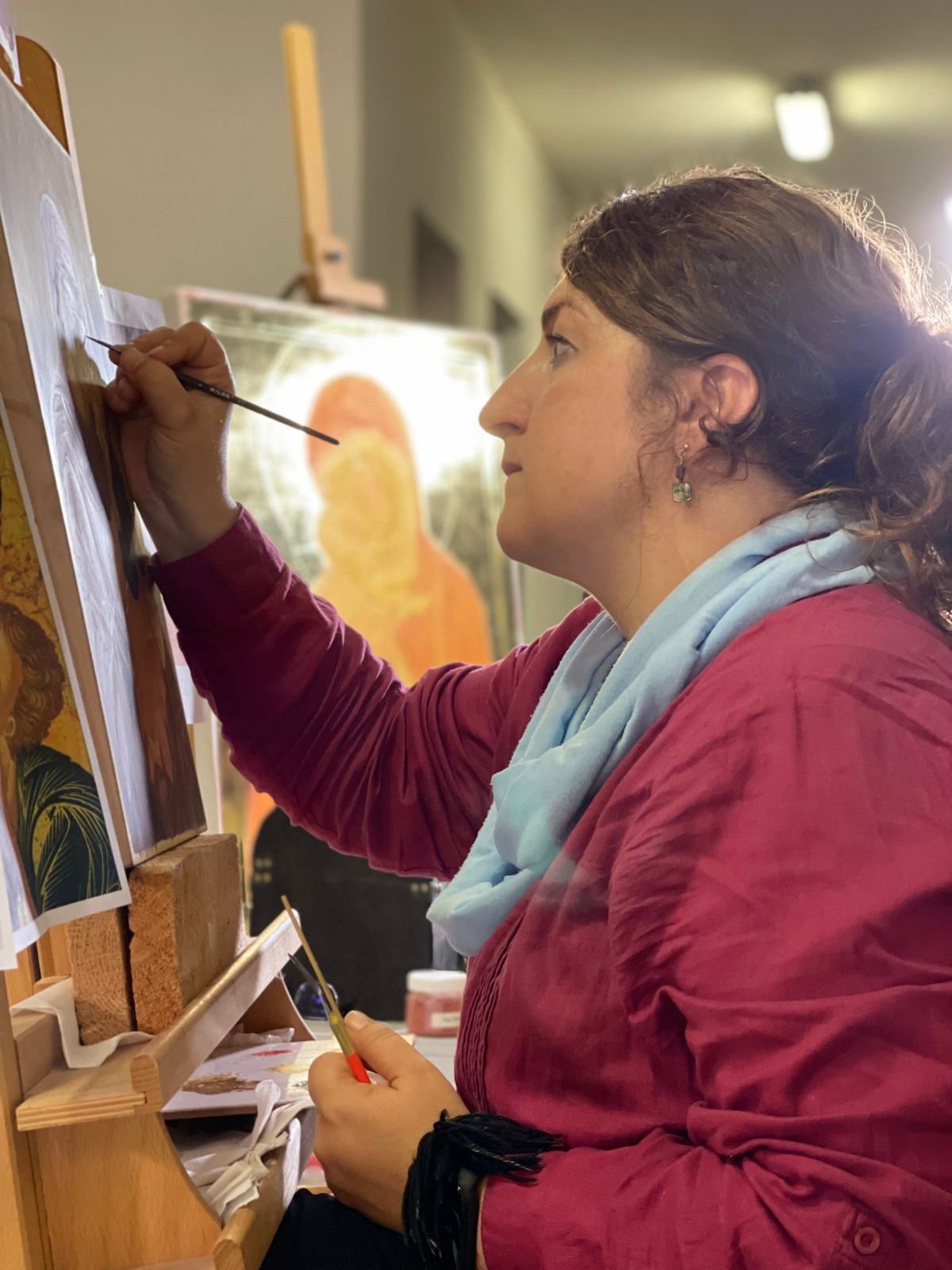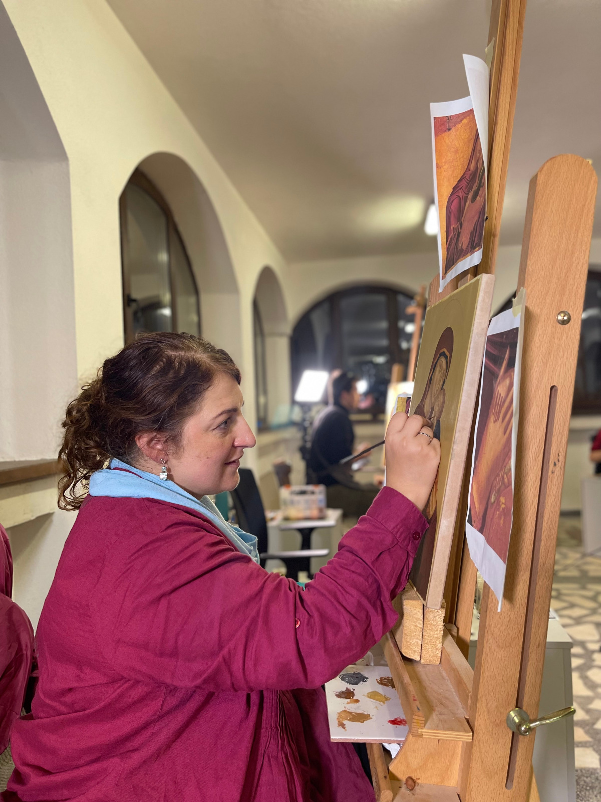 „Anul trecut, când am venit prima dată în tabăra de iconografie, mi-am dorit să văd cum este să pictezi icoane într-un mediu specific, cu Sfânta Liturghie în fiecare dimineață și cu post. Un post puțin mai aspru, la care, pe lângă regimul alimentar, se adaugă lipsa somnului și automat fără social-media. Într-o lume în care manipularea prin imagine este la putere, tabăra de iconografie reprezintă o purificare vizuală. Să scoți ochii din telefon și, chiar mai mult, să-i îndrepți spre icoane într-un studiu amănunțit este o adevărată binecuvântare. Alt avantaj pe care l-a adus această tabără a fost că ne-am strâns aici tineri de toate vârstele, din toate colțurile țării, cu aceeași preocupare, dar cu experiențe și stiluri diferite de lucru. Și, cel mai important, toți dornici să-și împărtășească cunoștințele și să învețe de la ceilalți. Diversitatea stilurilor de lucru confirmă faptul că nu există o formulă standard pentru icoană, singurul punct comun fiind dragostea și dăruirea fiecăruia. Să pictezi icoane este un fel intim de a cunoaște și relaționa cu Dumnezeu și sfinții Săi, iar scopul final nu este o lucrare de expoziție, limpezimea tușei sau alte performanțe. Adevărate icoane ale Domnului suntem noi, pentru că suntem chipul lui Dumnezeu și aici este adevărata lucrare. Prin pictarea icoanei nu se caută neapărat rezultatul final concretizat într-un lucru material, simplu tablou, ci întreg procesul de lucru care reprezintă o adevărată aventură. Aventura începe cu cercetare, cuprinde relaționare cu cei din jur, autocunoaștere, luptă cu gândurile și un amalgam de trăiri, iar în final un procent mic de cunoștințe tehnice privind desenul și tehnica de lucru. Lumea în care trăim este o lume a competiției, chiar este căutată această abilitate de a fi competitiv în jungla numită piața muncii. La Oașa, această non-valoare este anihilată. Este fabulos să te găsești într-o lume în care scopul nu este să fii mai bun decât ceilalți, ci doar să fii tu la capacitatea ta maximă. Toți din jurul tău sunt unici, foarte buni și valoroși, iar ce ai tu de făcut este doar să progresezi duhovnicește. Aceasta este cea mai valoroasă lecție pe care am învățat-o în tabăra de iconografie de la Oașa și îmi doresc să pot reveni în fiecare an” (Georgiana Busuioceanu).