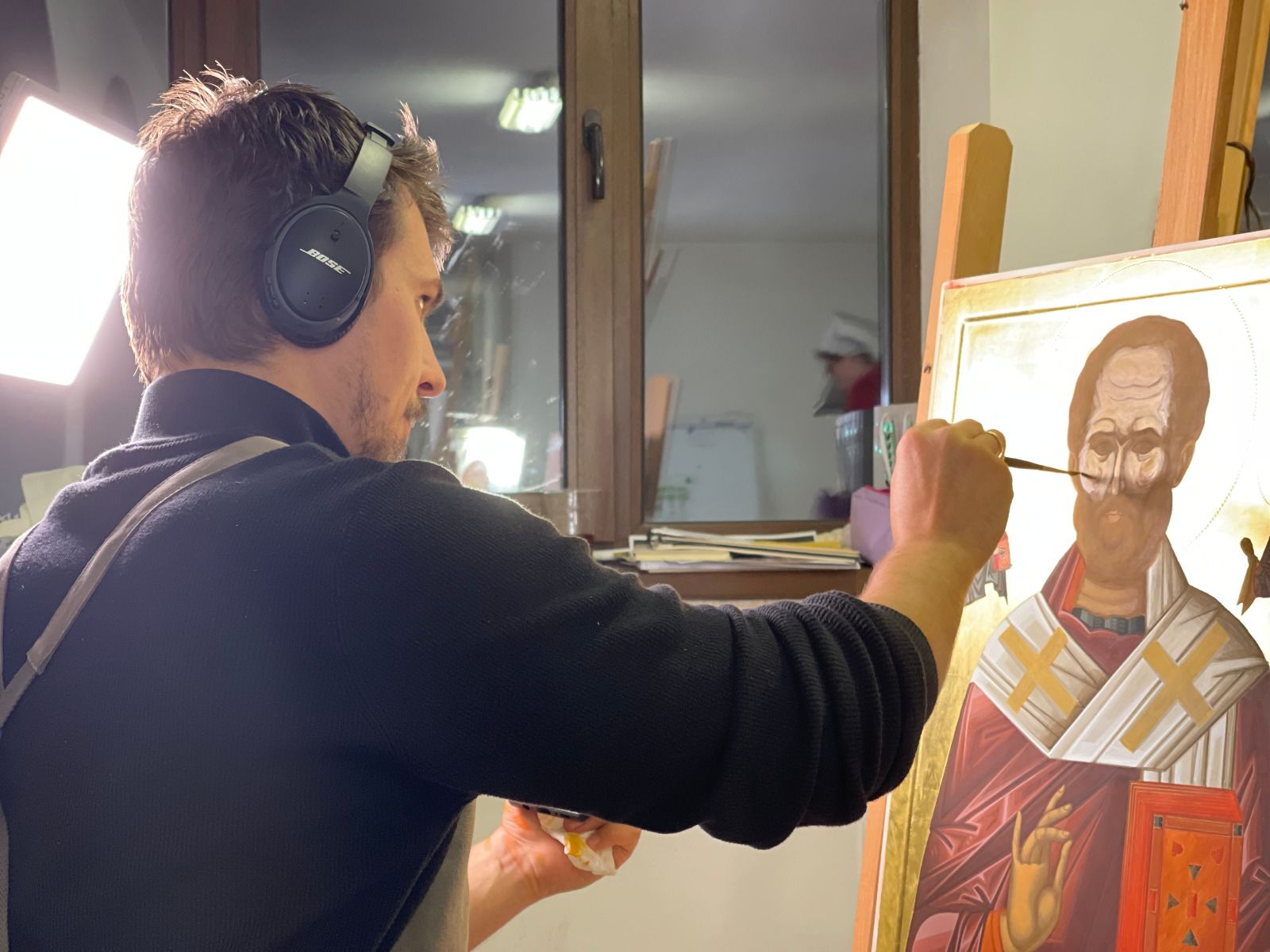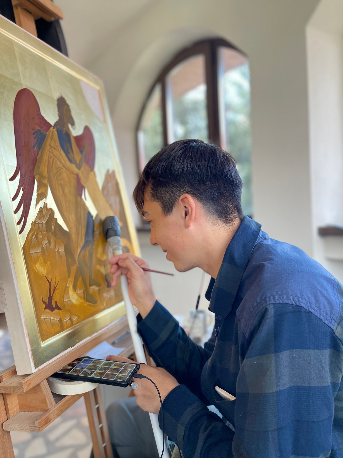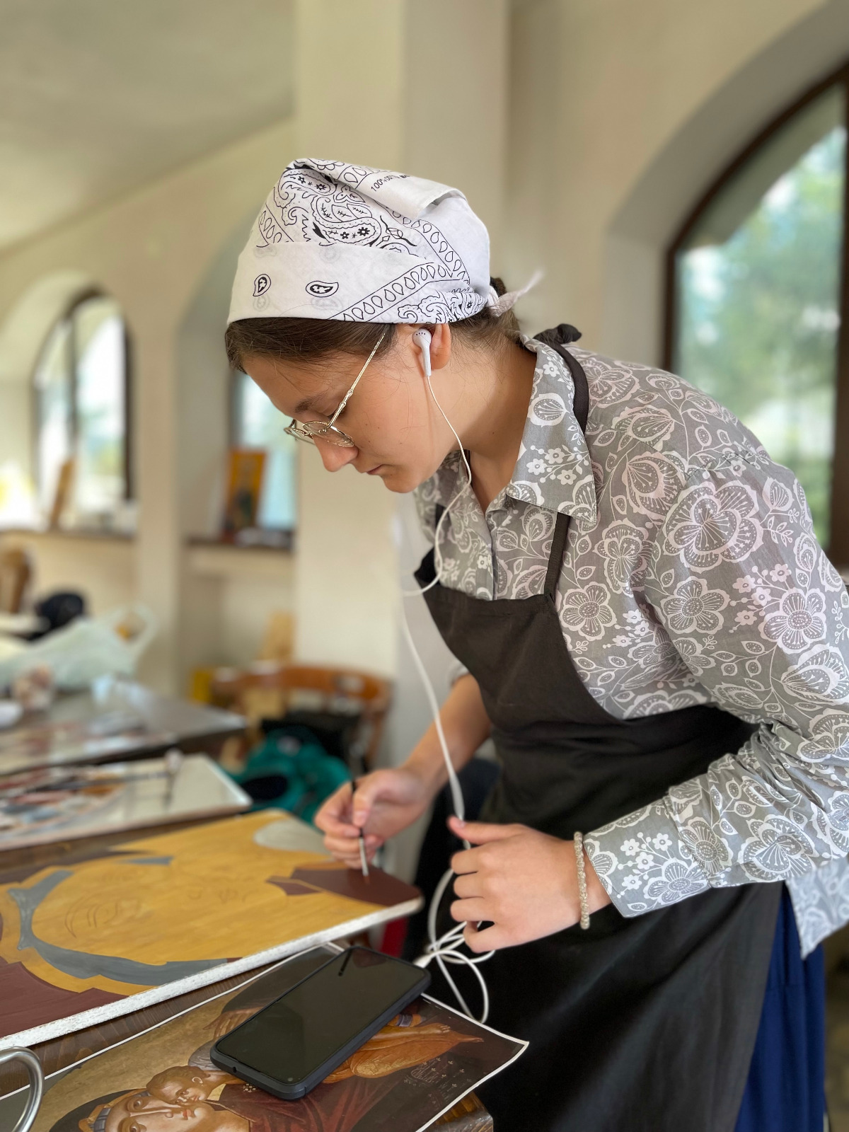 „Anul trecut, când am venit prima dată în tabăra de iconografie, mi-am dorit să văd cum este să pictezi icoane într-un mediu specific, cu Sfânta Liturghie în fiecare dimineață și cu post. Un post puțin mai aspru, la care, pe lângă regimul alimentar, se adaugă lipsa somnului și automat fără social-media. Într-o lume în care manipularea prin imagine este la putere, tabăra de iconografie reprezintă o purificare vizuală. Să scoți ochii din telefon și, chiar mai mult, să-i îndrepți spre icoane într-un studiu amănunțit este o adevărată binecuvântare. Alt avantaj pe care l-a adus această tabără a fost că ne-am strâns aici tineri de toate vârstele, din toate colțurile țării, cu aceeași preocupare, dar cu experiențe și stiluri diferite de lucru. Și, cel mai important, toți dornici să-și împărtășească cunoștințele și să învețe de la ceilalți. Diversitatea stilurilor de lucru confirmă faptul că nu există o formulă standard pentru icoană, singurul punct comun fiind dragostea și dăruirea fiecăruia. Să pictezi icoane este un fel intim de a cunoaște și relaționa cu Dumnezeu și sfinții Săi, iar scopul final nu este o lucrare de expoziție, limpezimea tușei sau alte performanțe. Adevărate icoane ale Domnului suntem noi, pentru că suntem chipul lui Dumnezeu și aici este adevărata lucrare. Prin pictarea icoanei nu se caută neapărat rezultatul final concretizat într-un lucru material, simplu tablou, ci întreg procesul de lucru care reprezintă o adevărată aventură. Aventura începe cu cercetare, cuprinde relaționare cu cei din jur, autocunoaștere, luptă cu gândurile și un amalgam de trăiri, iar în final un procent mic de cunoștințe tehnice privind desenul și tehnica de lucru. Lumea în care trăim este o lume a competiției, chiar este căutată această abilitate de a fi competitiv în jungla numită piața muncii. La Oașa, această non-valoare este anihilată. Este fabulos să te găsești într-o lume în care scopul nu este să fii mai bun decât ceilalți, ci doar să fii tu la capacitatea ta maximă. Toți din jurul tău sunt unici, foarte buni și valoroși, iar ce ai tu de făcut este doar să progresezi duhovnicește. Aceasta este cea mai valoroasă lecție pe care am învățat-o în tabăra de iconografie de la Oașa și îmi doresc să pot reveni în fiecare an” (Georgiana Busuioceanu).