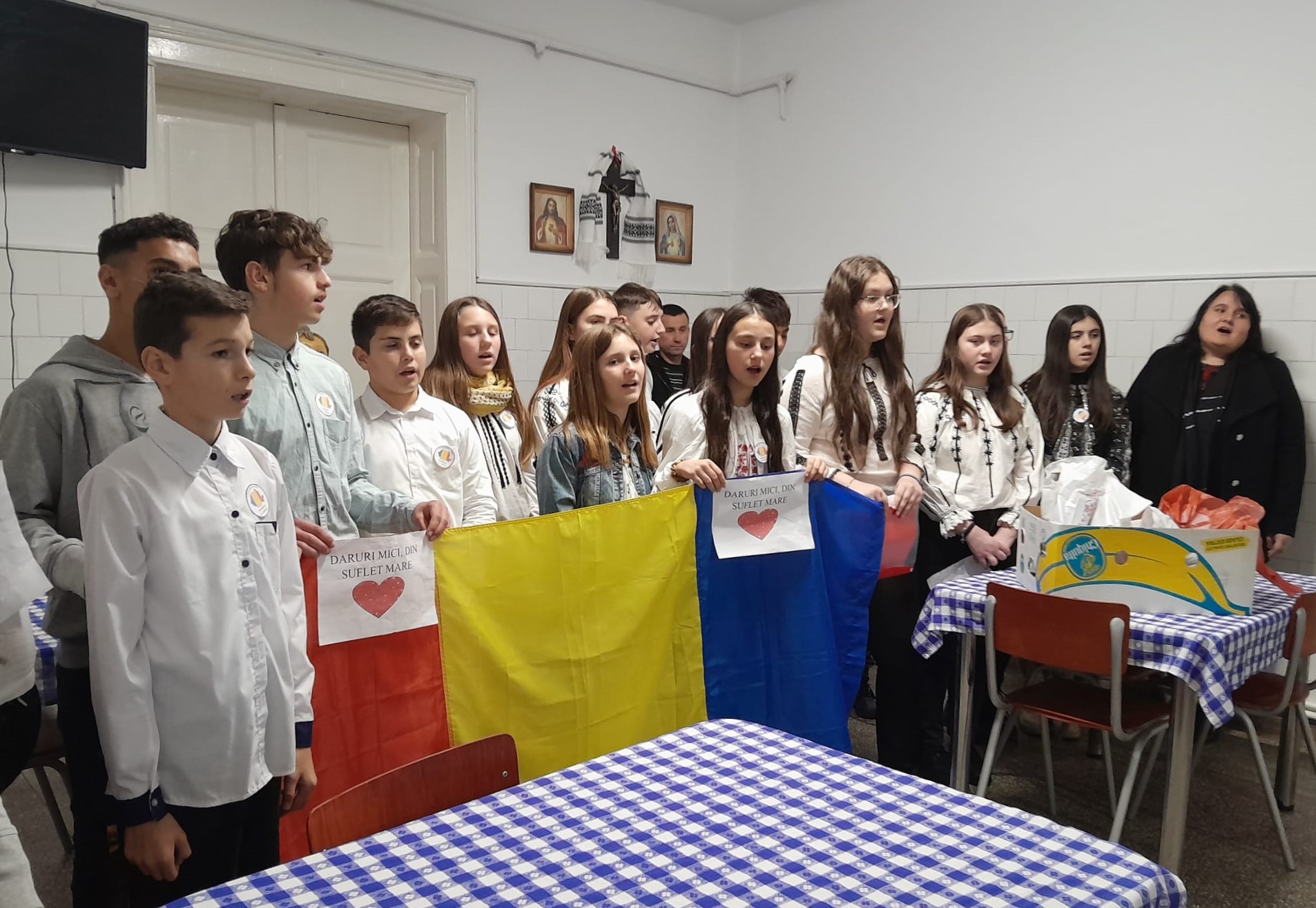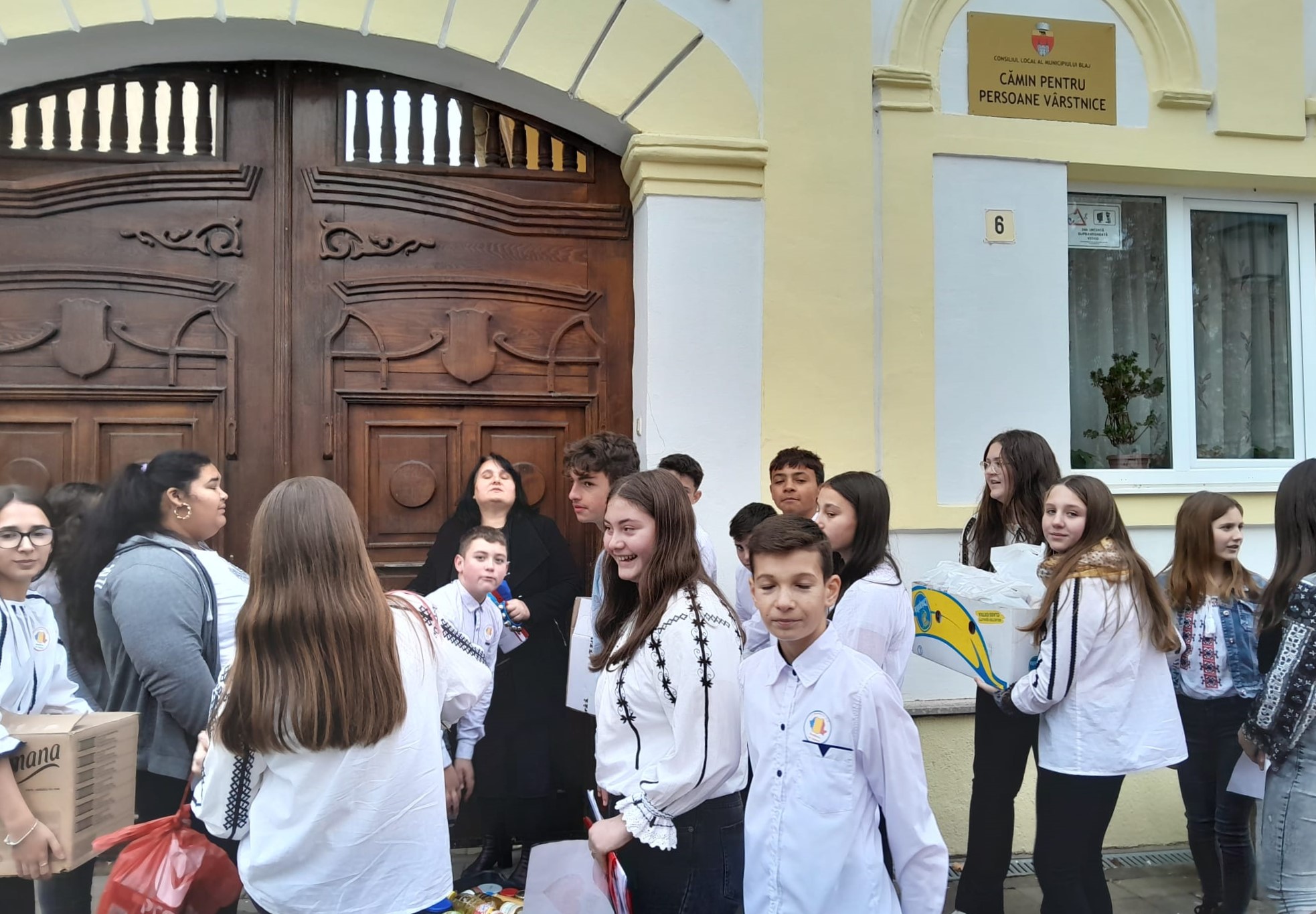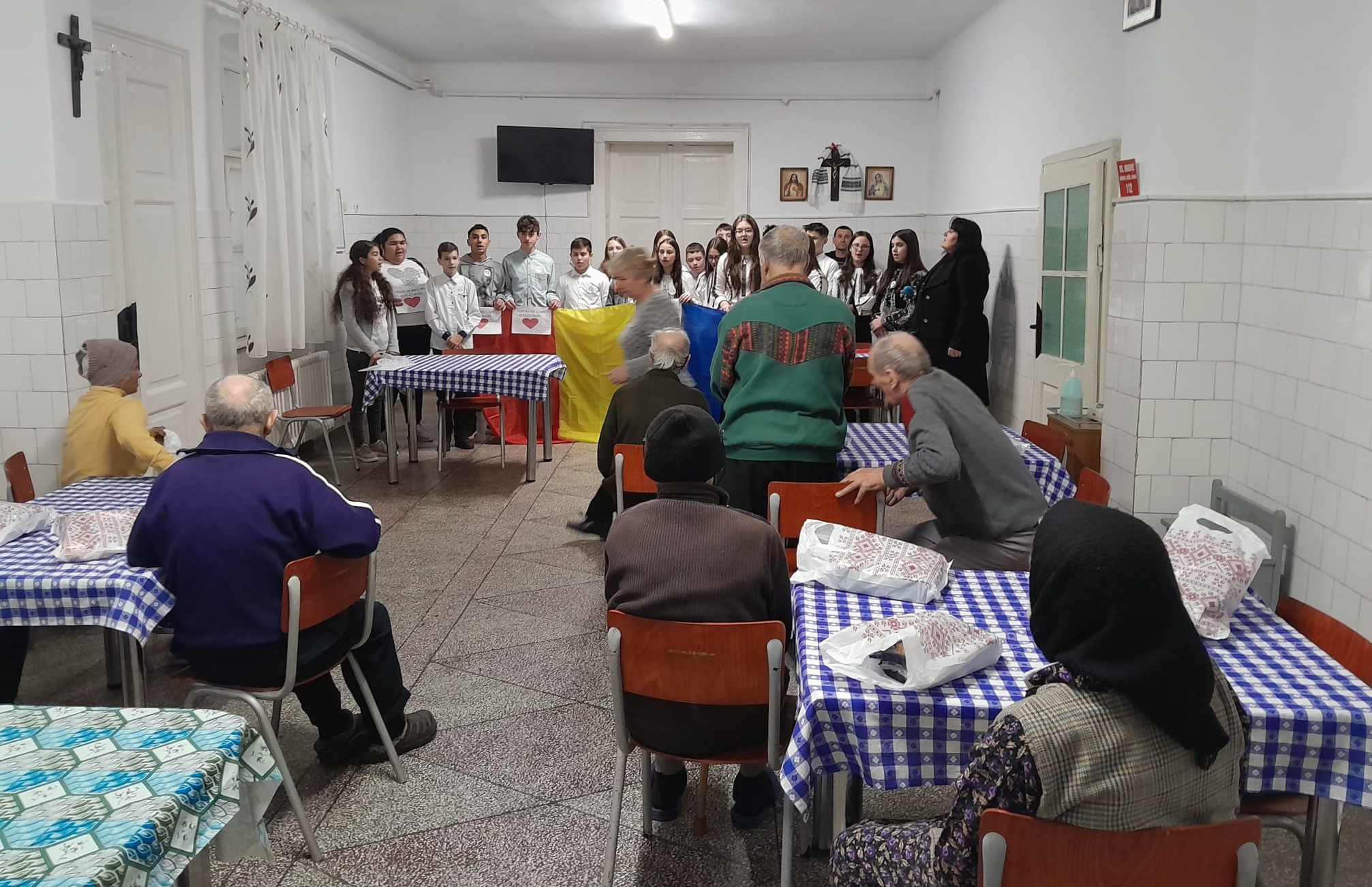 La Centrul Social „Sfânta Parascheva” din Blaj, părintele protopop Ovidiu Pop, împreună cu doamna Veronica Pop, i-au întâmpinat pe copii cu multă bucurie și căldură, cu un cuvânt de folos despre puterea rugăciunii și a faptelor bune. În continuare, tinerii au interpretat un buchet de colinde și cântece patriotice, pentru a trăi împreună bucuria de a fi român și bun creștin în preajma sărbătorilor de iarnă. Totodată, și la Căminul pentru persoane vârstnice din Blaj au răsunat glasurile curate ale elevilor din clasele V-VIII, prin desfășurarea programul artistic de colinde și cântece patriotice. Aici elevii au fost întâmpinați de doamna director Maria Borșoi, care le-a adresat elevilor un cuvânt de mulțumire.
